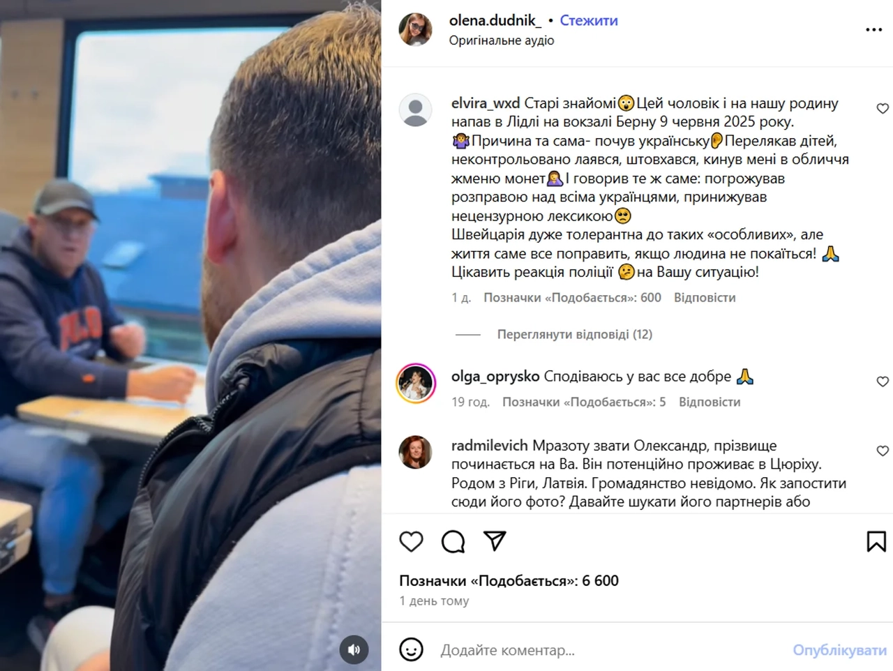 “I was traveling with my husband and our son (1 year, 10 months) on the train, and we sat across from these ‘people,’ if you can call them people! The conflict started because this person heard me talking to my husband in Ukrainian! My husband was born in Switzerland, has Swiss citizenship, and understands Ukrainian perfectly, while his parents are originally from Belarus,” Dudnik wrote.
