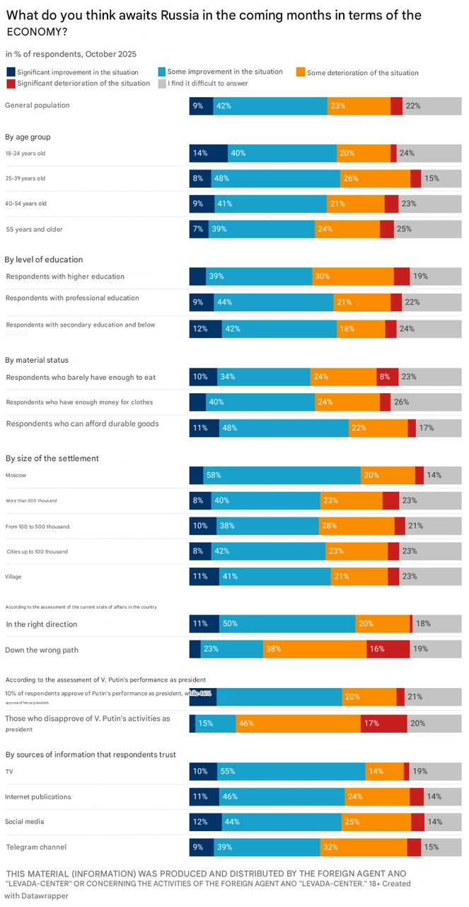 “Sustained optimism has been eroding in recent months,” Levada wrote, noting that the share of respondents expecting near-term economic improvement rose consistently since 1994, peaked in May 2024 at 64 %, and has been dropping since.