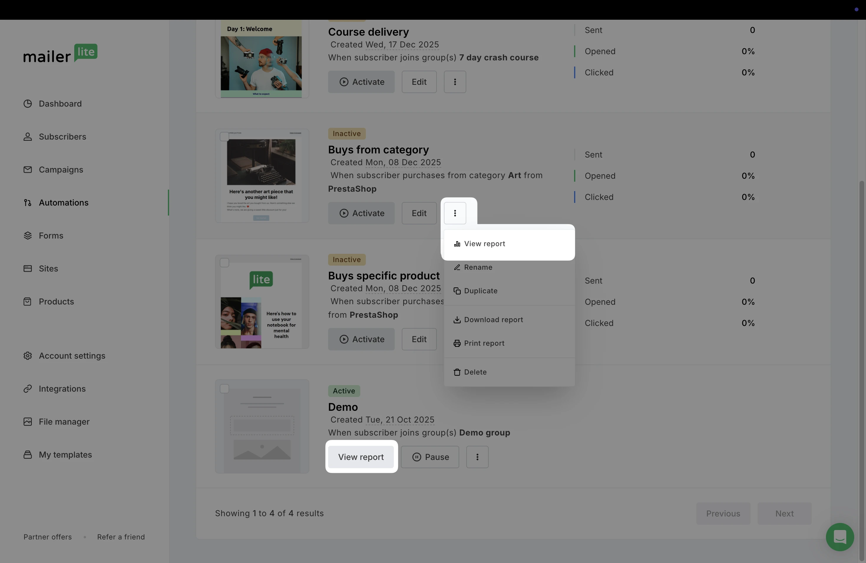 For inactive workflows, click the three dots and choose View report. For active automations, click on the View report button of the automation you want to monitor.