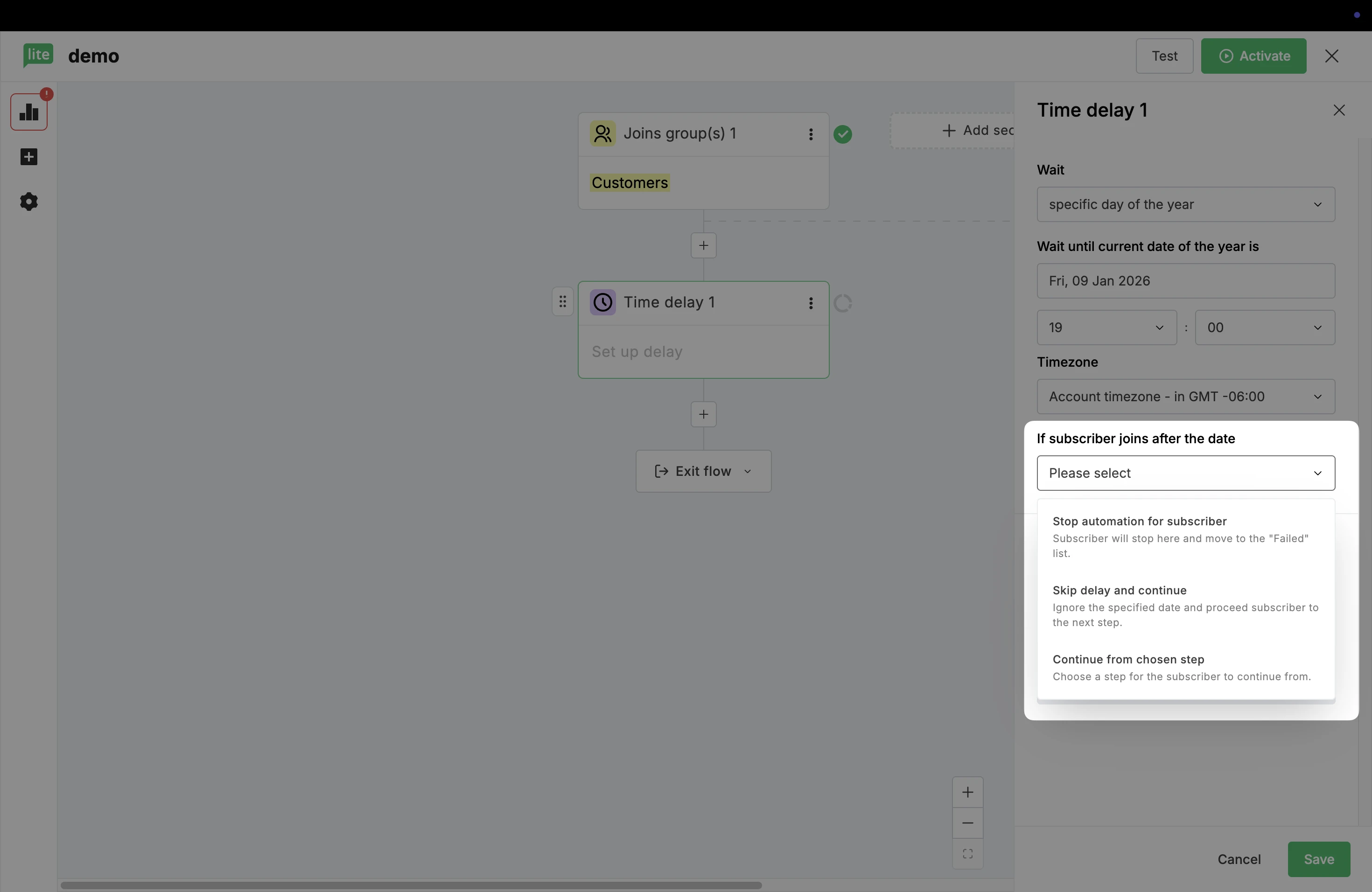If subscribers land on the delay step after the selected date and time has passed, you can choose what happens: