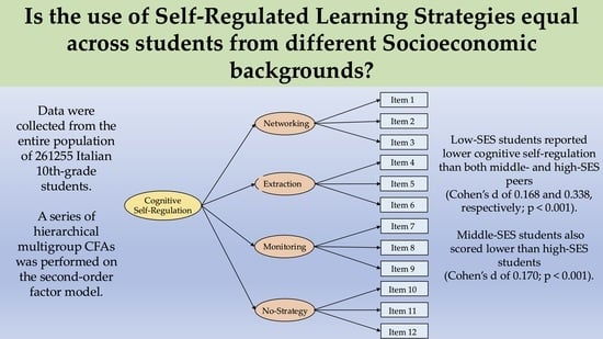 Background: Self-regulated learning (SRL) is a key factor in academic success, with self-regulated cognitive strategies (SRCSs) playing a central role. Identifying the factors linked to low use of SRCSs is therefore essential. Socioeconomic status (SES), a well-established predictor of multiple educational outcomes, may also influence students’ engagement in SRCSs, yet very few studies have explored this issue. Grounded in the SRL framework, this study examines differences in SRCSs use across SES groups. Methods: We analyzed data from the entire population of 10th-grade Italian students (N = 261,255). To ensure that the questionnaire functions equivalently across groups and control for measurement bias and error, Multigroup Confirmatory Factor Analysis was conducted to verify the measurement invariance of the Cognitive Self-Regulation Scale across three SES groups (low, middle, and high), followed by latent mean difference tests. Results: Low-SES students reported markedly lower CSRS use than high-SES peers and also lower use than middle-SES peers. Middle-SES students reported lower use of CSRS than high-SES students. Conclusions: These findings show a clear and consistent impact of SES on the use of SRCSs, potentially contributing to persistent academic disparities, and emphasize the need for interventions to support disadvantaged students, thereby helping to break the cycle of inequality.
