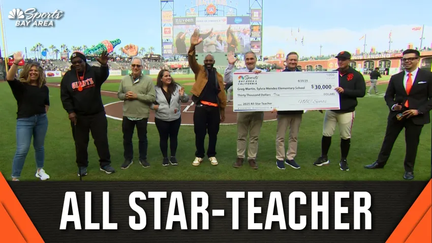 Sylvia Mendez Elementary School’s Greg Martin speaks with NBC Sports Bay Area’s Carlos Ramirez after winning the 2025 All-Star Teacher grand prize.