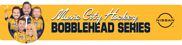 Join the Nashville Predators as we celebrate Smashville’s home in Music City with our Music City Hockey Bobblehead Series, featuring an exclusive giveaway for the first 10,000 fans in attendance! The limited edition bobbleheads will feature Nashville icons who are Preds fans, including Nate Bargatze, Dierks Bentley, Luke Bryan, Carrie Underwood and Mike Fisher!