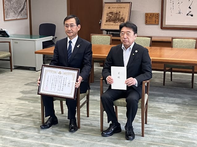 大分銀行は1日、大分市佐賀関の大規模火災で被災者支援や復興に充ててもらおうと、市に1000万円を寄付した。市役所で足立信也市長に目録を手渡した高橋靖英頭取は「地域の復興のためできる限りサポートしていく。過去になかった対応もしないといけないと思っている」などと話した。