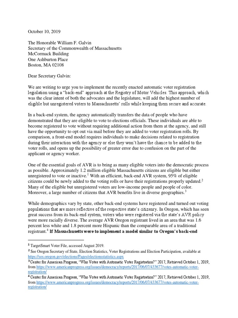 October 10, 2019 The Honorable William F. Galvin Secretary of the Commonwealth of Massachusetts McCormack Building One Ashburton Place Boston, MA 02108 Dear Secretary Galvin: We are writing to urge you to implement the recently enacted automatic voter registration