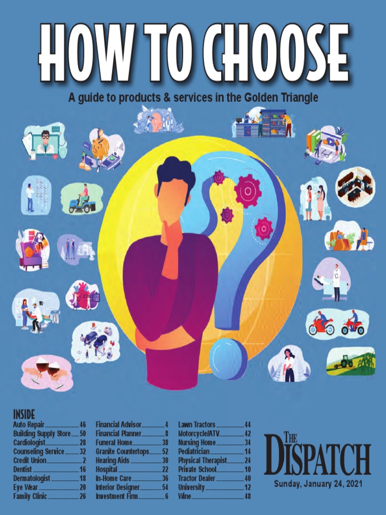 Auto Repair ......................46Building Supply Store .....50Cardiologist ......................28Counseling Service .........32Credit Union .......................2Dentist ..............................16Dermatologist ..................18Eye Wear ..........................20Family Clinic ....................26Financial Advisor ...............4Financial Planner ...............8Funeral Home ...................38Granite Countertops ........52Hearing Aids ....................30Hospital ............................22In-Home Care ...................36Interior Designer ..............54Investment Firm .................6Lawn Tractors ..................44Motorcycle/ATV ................42Nursing Home ..................34Pediatrician ......................14Physical Therapist ...........24Private School ..................10Tractor Dealer ..................40University .........................12Wine ..................................48