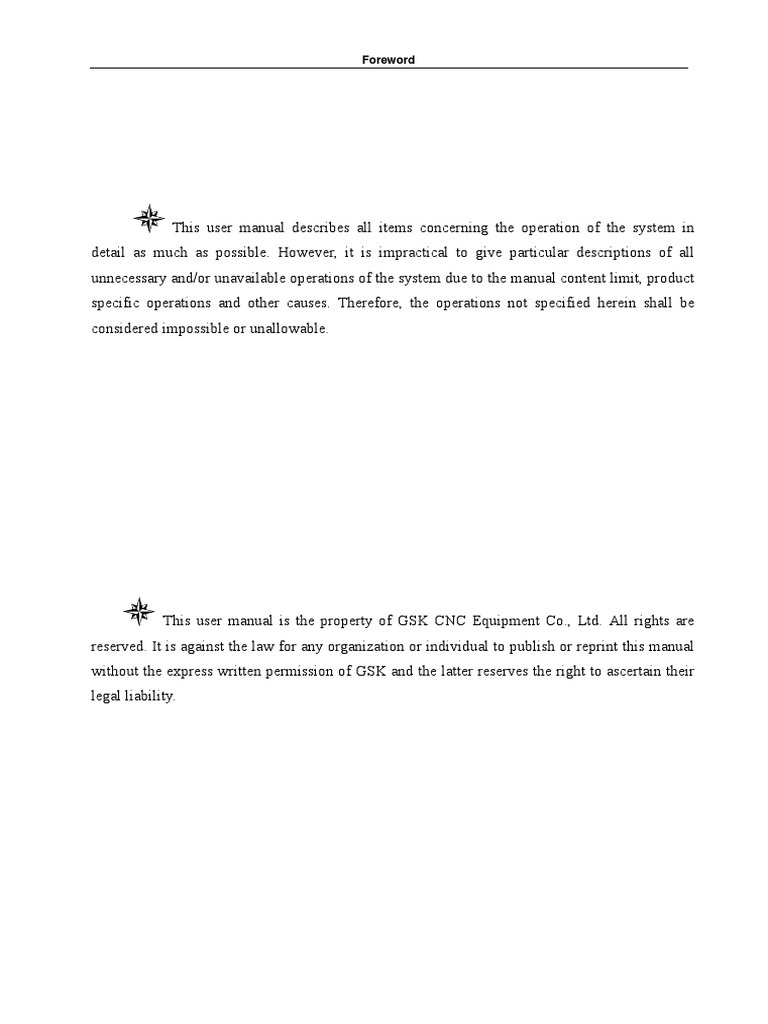 The document is a user manual for the GSK980TB3 Series Turning CNC System. It describes in detail the operation of the system and provides important safety information and precautions for users. However, it does not describe all possible operations due to limitations of the manual. The manual is the property of GSK CNC Equipment Co., Ltd. and requires their written permission to publish or reprint. The systems it covers are GSK980TB3 and GSK980TB3-V lathe CNC systems with 7-inch LCD screens. The GSK980TB3 is an upgraded version of the GSK980TB2 that adds features like automatic feeding and groove cycle processing to improve machining efficiency, precision and surface finish.