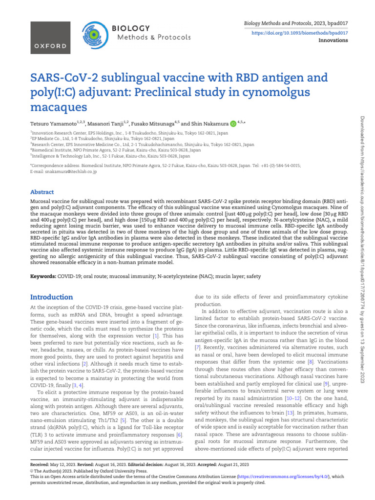 “SARS-CoV-2 Sublingual Vaccine with RBD Antigen and Poly(I:C) Adjuvant: Preclinical Study in Cynomolgus Macaques”