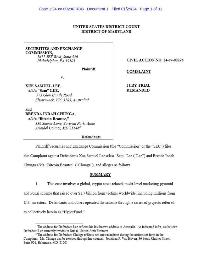 This case involves an alleged $1.7 billion global crypto asset pyramid and Ponzi scheme called HyperFund that was operated through a series of projects from June 2020 to May 2022. The SEC alleges that HyperFund offered unregistered securities in the form of membership packages promising daily returns of 0.5-1% through crypto mining. However, HyperFund had no real revenue and paid returns using new investor funds. Defendant Xue Samuel Lee was a co-founder who promoted bogus mining claims. Defendant Brenda Chunga was a top US promoter who received over $3.7 million from HyperFund and investors. The SEC alleges they violated securities laws through an unregistered offering of securities and material misrepresentations.