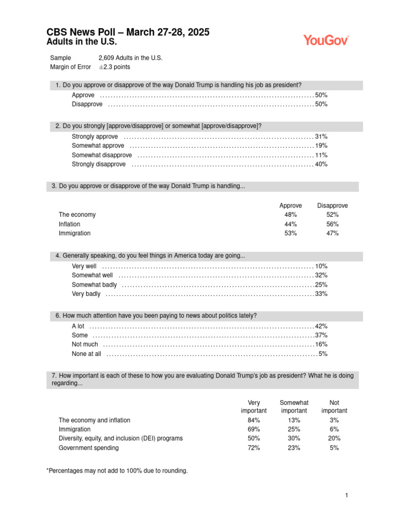 A CBS News poll conducted from March 27-28, 2025, surveyed 2,609 U.S. adults, revealing a split approval rating for President Donald Trump at 50% each for approval and disapproval. Key issues evaluated include the economy, inflation, and immigration, with varying levels of public concern and approval regarding Trump's handling of these topics. The poll also indicates significant public sentiment regarding the impact of Trump's policies on personal finances and the job market.