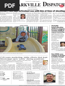 Starkville Dispatch Eedition 3-18-21PDFStarkville Dispatch Eedition 3-18-21Added by The Dispatch0 ratingsfunction jt(e,t){var n=e+t;return n<=0?0:Math.round(e/n*100)}% found this document usefulSave Starkville Dispatch Eedition 3-18-21 for later
