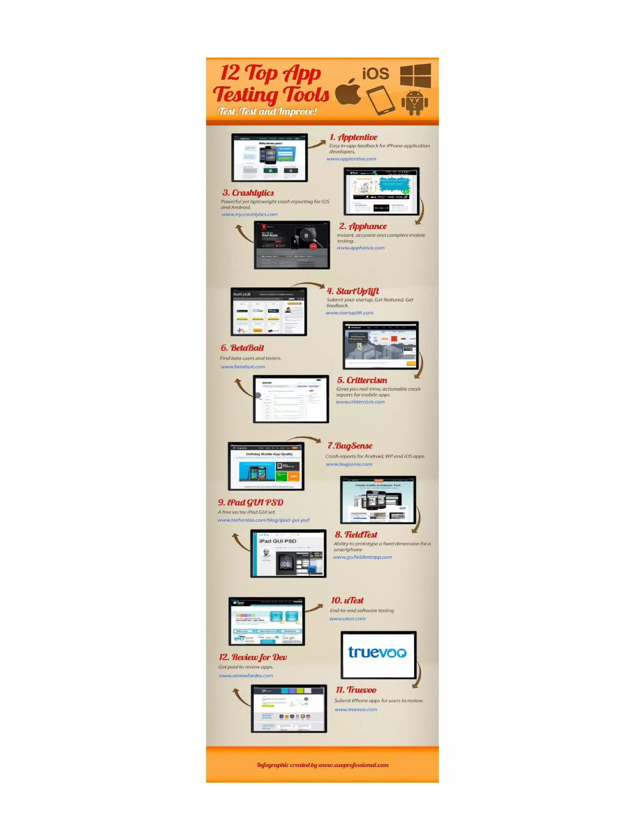 The document outlines various app testing and feedback tools aimed at helping developers improve their mobile applications. It features tools like Apptentive for in-app feedback, utest for comprehensive testing services, and Crashlytics for crash reporting. Additionally, it discusses platforms for obtaining beta testers and user reviews, emphasizing the importance of real-time data and customer interaction in app development.