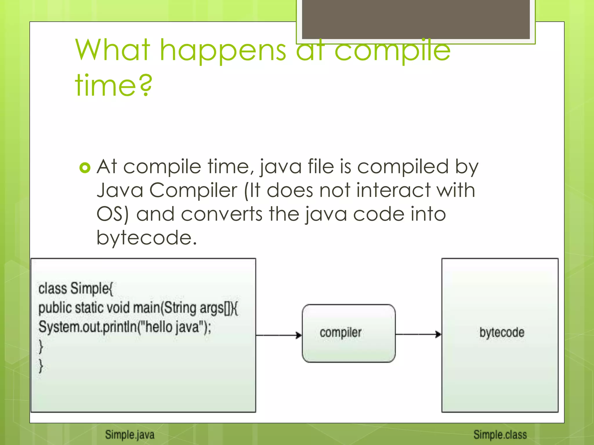 The document discusses the internal details of running a Java program. It explains that at compile time, the Java compiler converts Java code into bytecode. At runtime, the classloader loads the bytecode and the bytecode verifier checks for illegal code before the interpreter executes the instructions. It then addresses some questions about naming Java files and having multiple classes in a file. Finally, it defines the JVM, JRE, and JDK, explaining that the JVM executes bytecode, the JRE provides the runtime environment, and the JDK contains the JRE plus development tools.