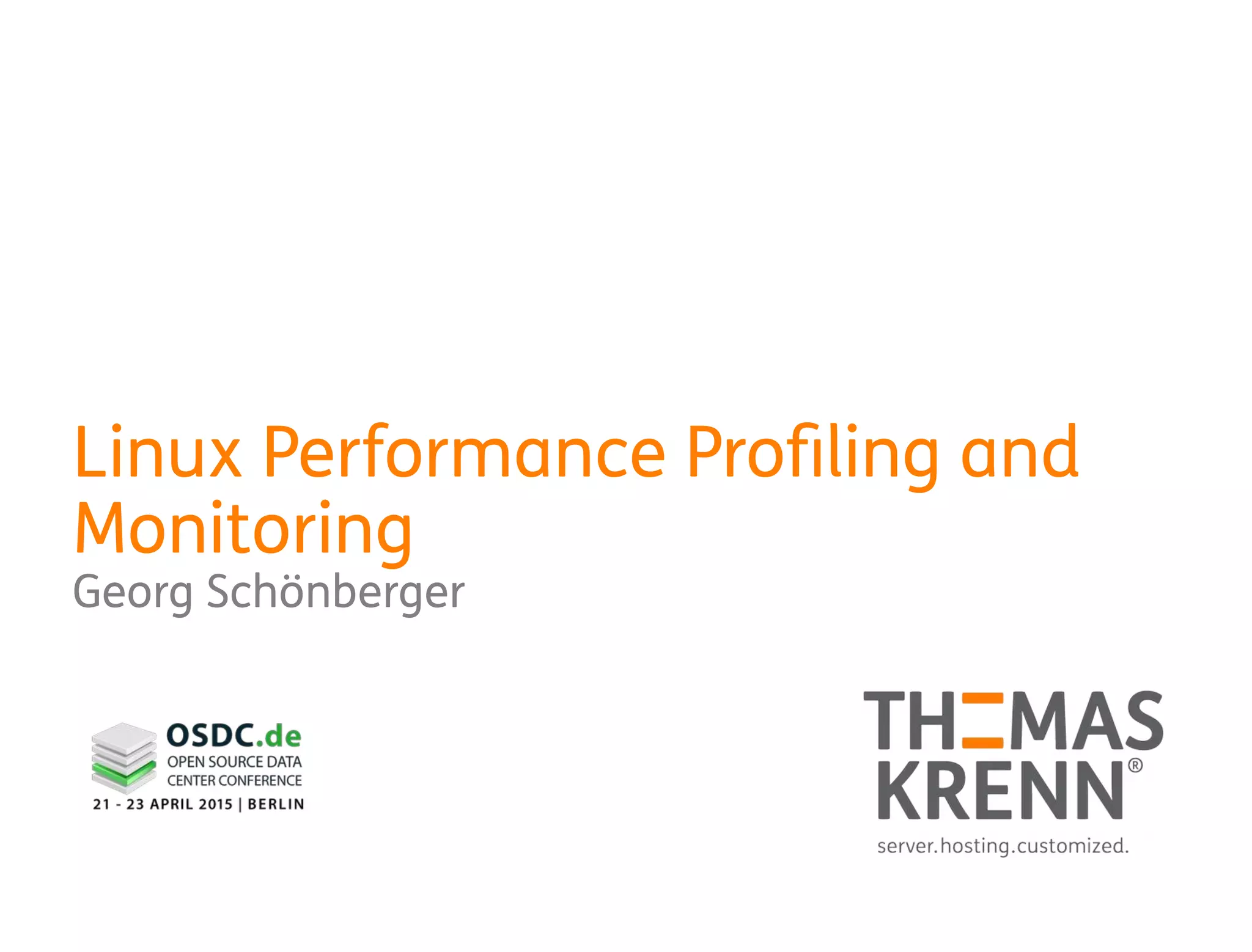 The document provides an in-depth guide on Linux performance profiling and monitoring, covering various tools and commands such as mpstat, vmstat, pidstat, and iostat to gather system statistics. It details methods to analyze CPU usage, memory utilization, and I/O performance, along with practical command examples. Additionally, it emphasizes the importance of understanding process states and resource allocation for optimizing server performance.
