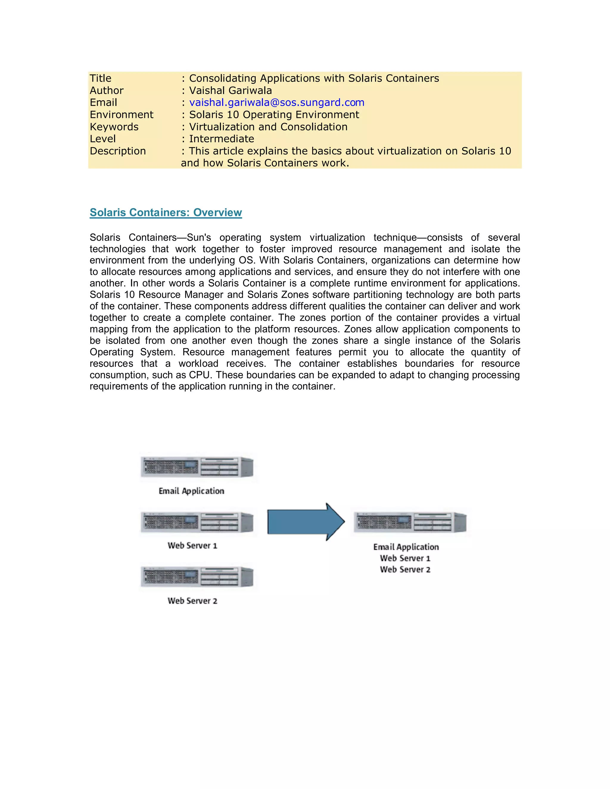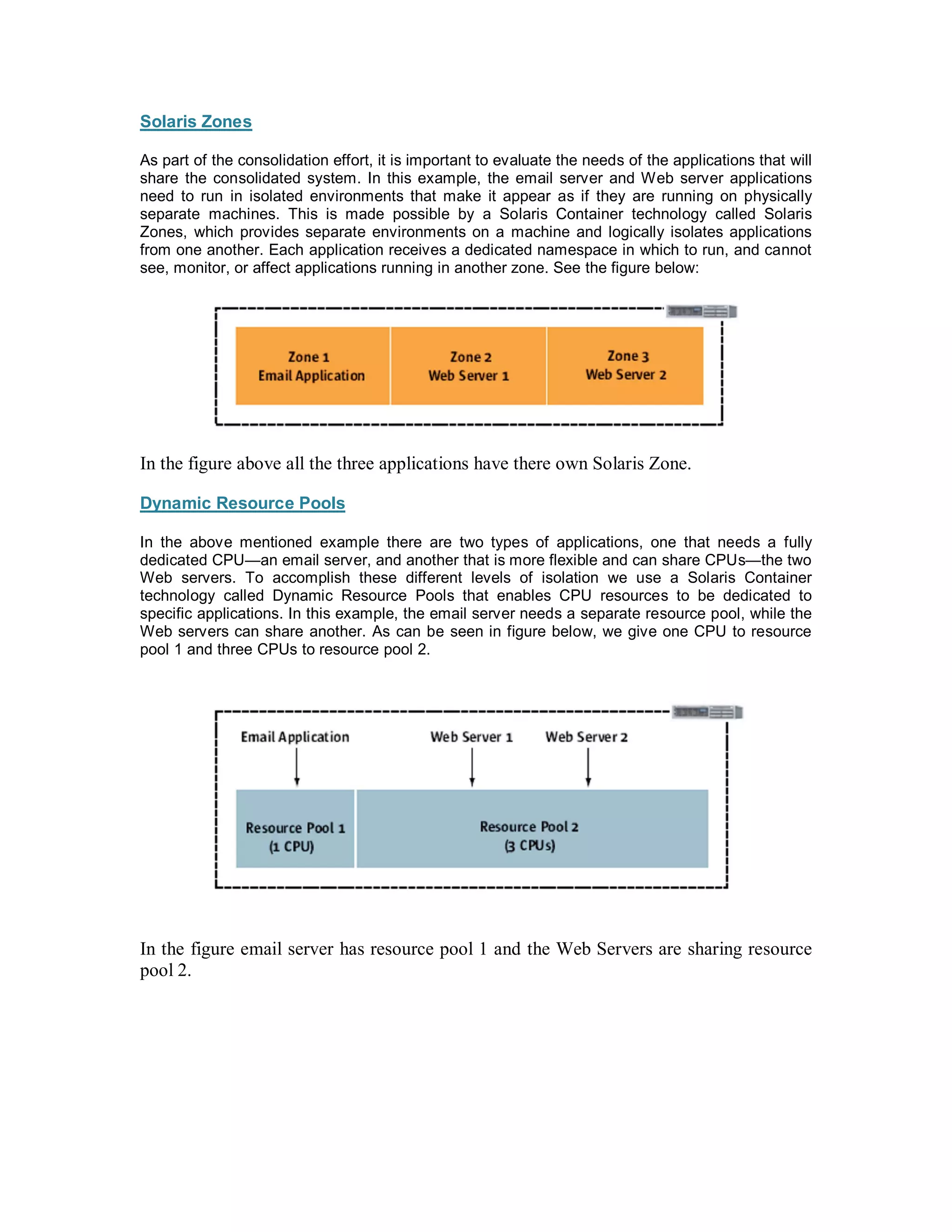 This document discusses how Solaris containers can be used to consolidate applications by providing isolation and allocating resources. It explains that Solaris containers use zones and resource pools to partition a single Solaris operating system instance. Zones isolate applications by providing separate namespaces, while resource pools allocate CPU resources. The document demonstrates how an email server can be isolated with its own dedicated resource pool, while two web servers share another pool and are further isolated using shares allocated by the fair share scheduler.
