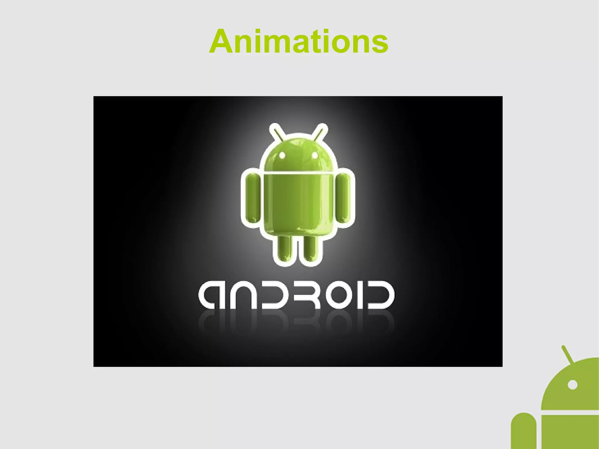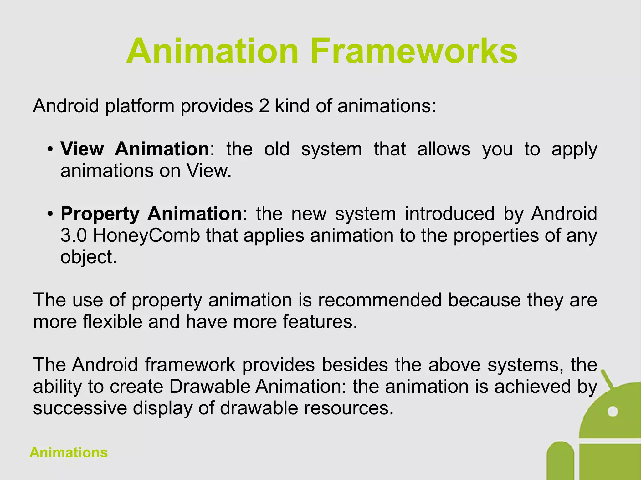 The document discusses different animation systems available in Android including view animation, property animation, and drawable animation. View animation allows animating views and can translate, scale, rotate, and change opacity. Property animation applies animations to object properties and offers more flexibility. Drawable animation displays sequential drawables to create animation.