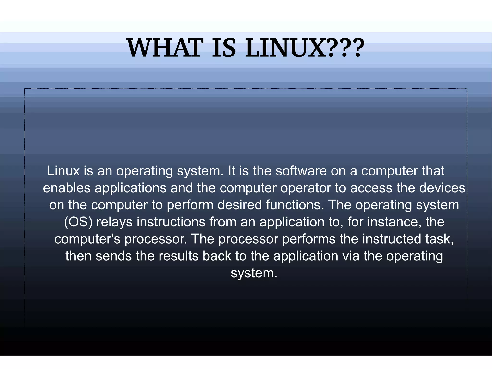 Linux is an open-source operating system that provides free and secure software. It allows applications and users to access computer devices and functions through the kernel, which manages communication between hardware, software, and processes. Files, directories, programs, and devices are all treated as files in the Linux file system hierarchy, accessed through commands like ls, mkdir, and rmdir.