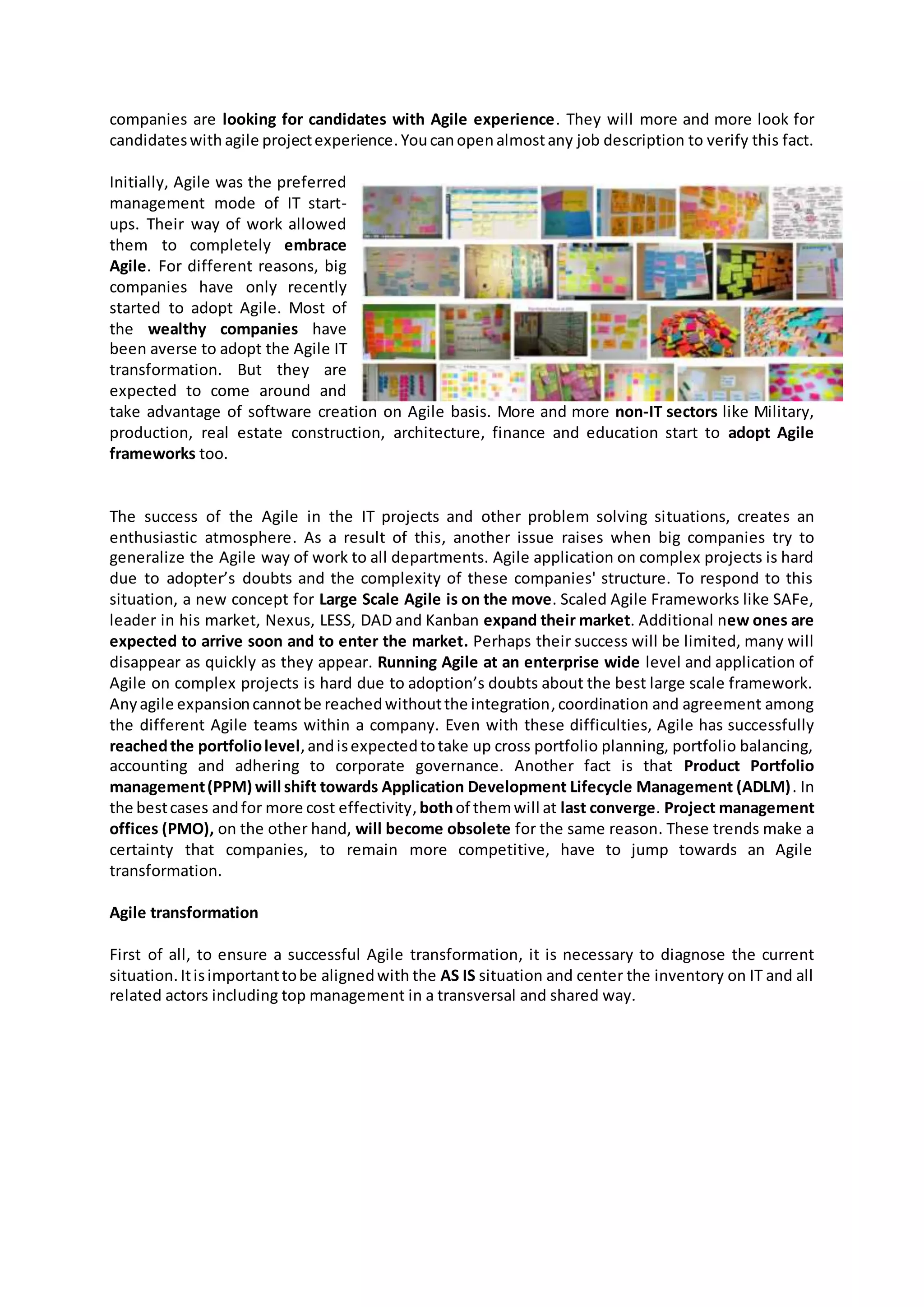 2. Large companies are increasingly adopting Agile methods to speed up strategic decision making and improve efficiency through closer collaboration. However, implementing Agile across complex organizations remains challenging.