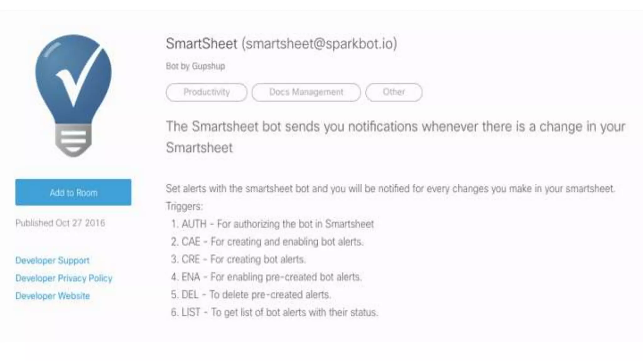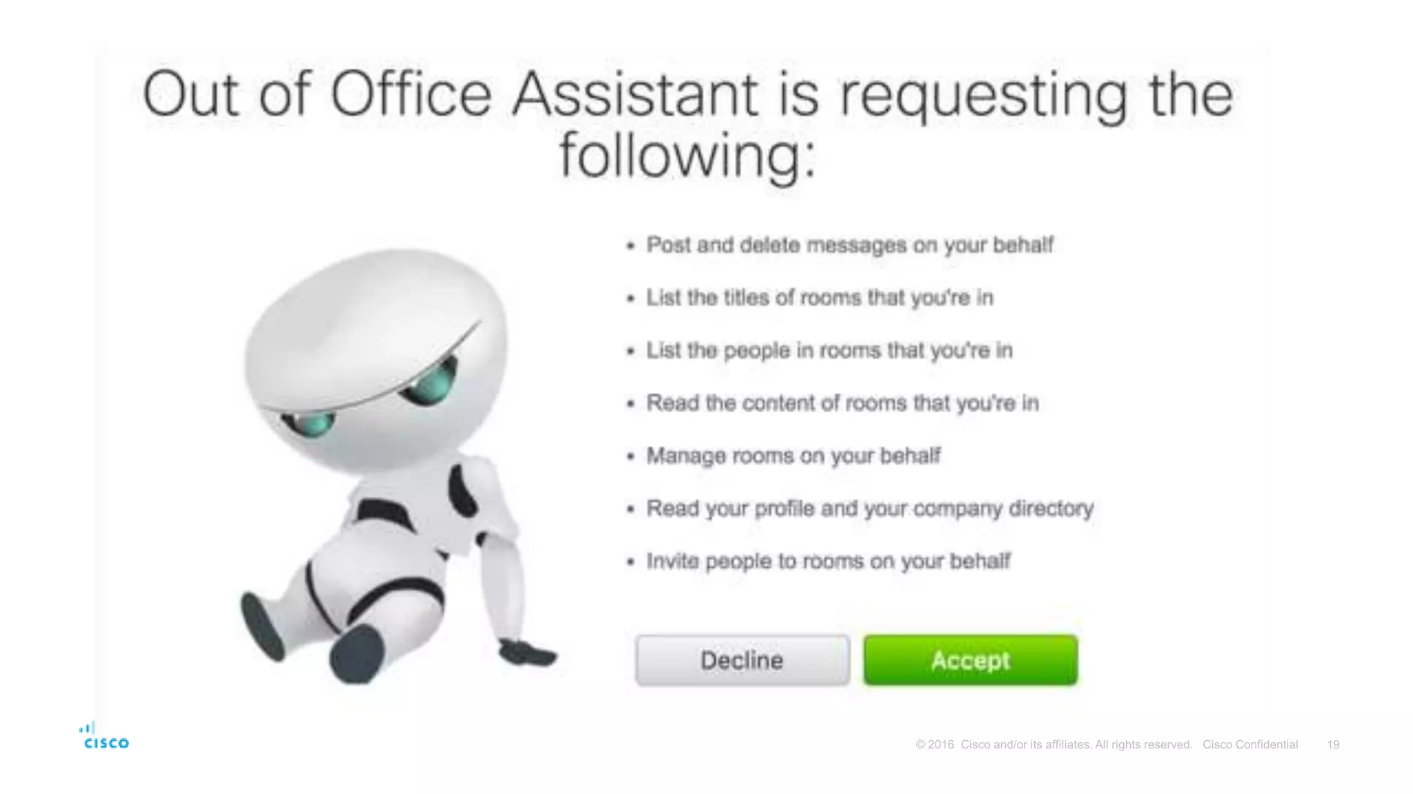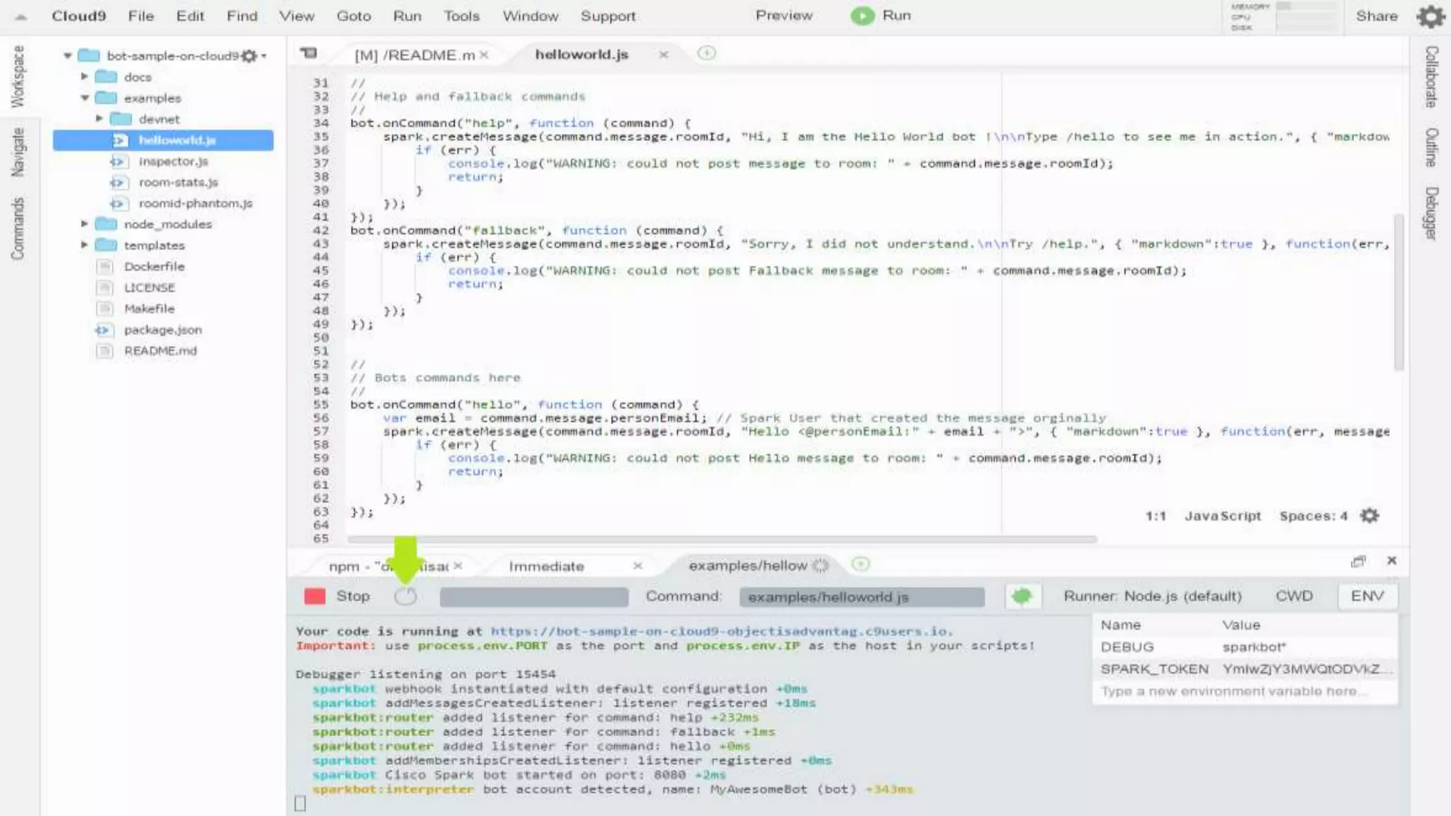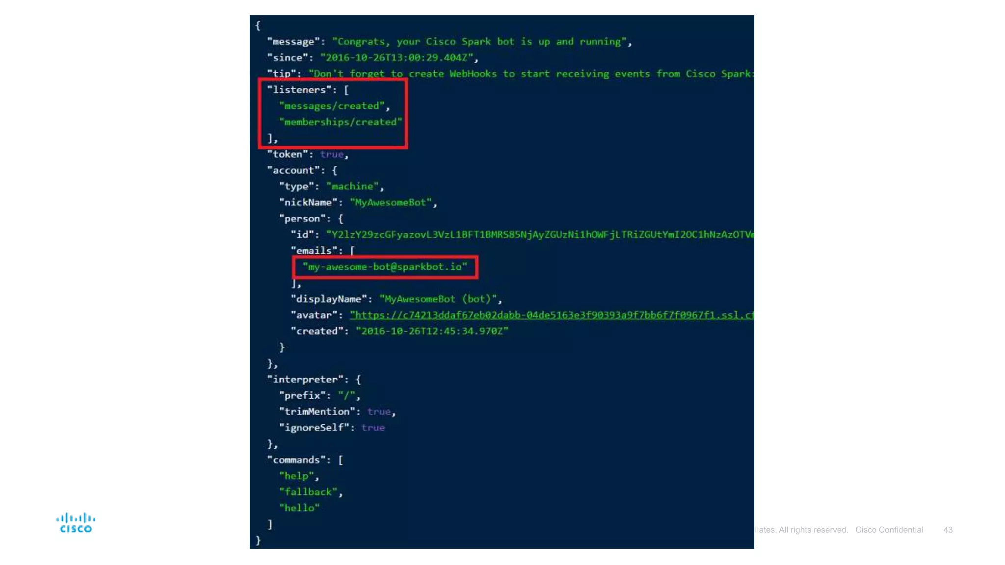 - This document provides instructions for building a basic chat bot using the Cisco Spark API and deploying it on Cloud9. It discusses what chat bots are and their benefits. It then walks through setting up a Cisco Spark account, creating a bot profile, deploying the bot code to Cloud9, adding webhook events to trigger the bot, and testing the bot responses.