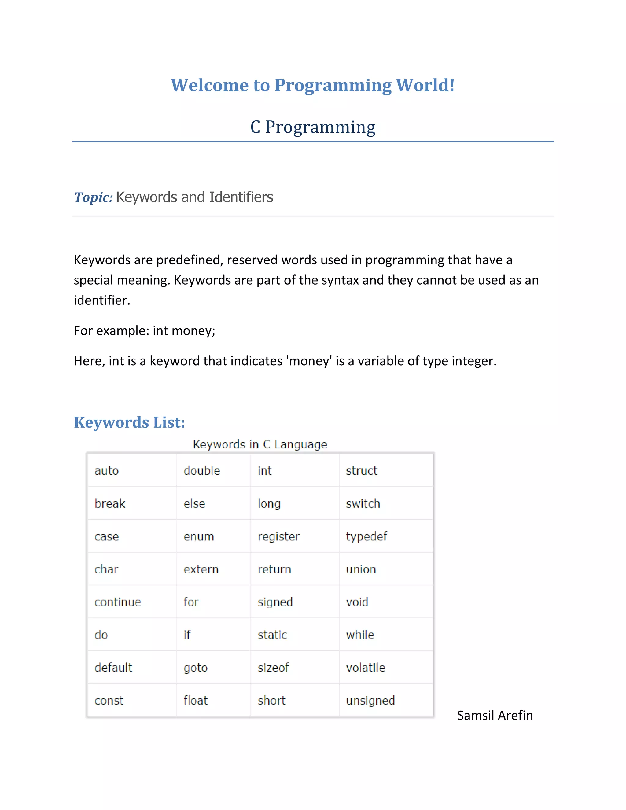 The document provides an introduction to C programming, covering key concepts such as keywords, identifiers, constants, variables, data types, operators, conditional statements (if, switch), loops (for, while, do-while), functions, recursion, and parameter passing methods. It includes code examples demonstrating these concepts along with explanations. Additionally, exercises are provided for practice, focusing on basic calculator implementation, sorting numbers, and working with structures.