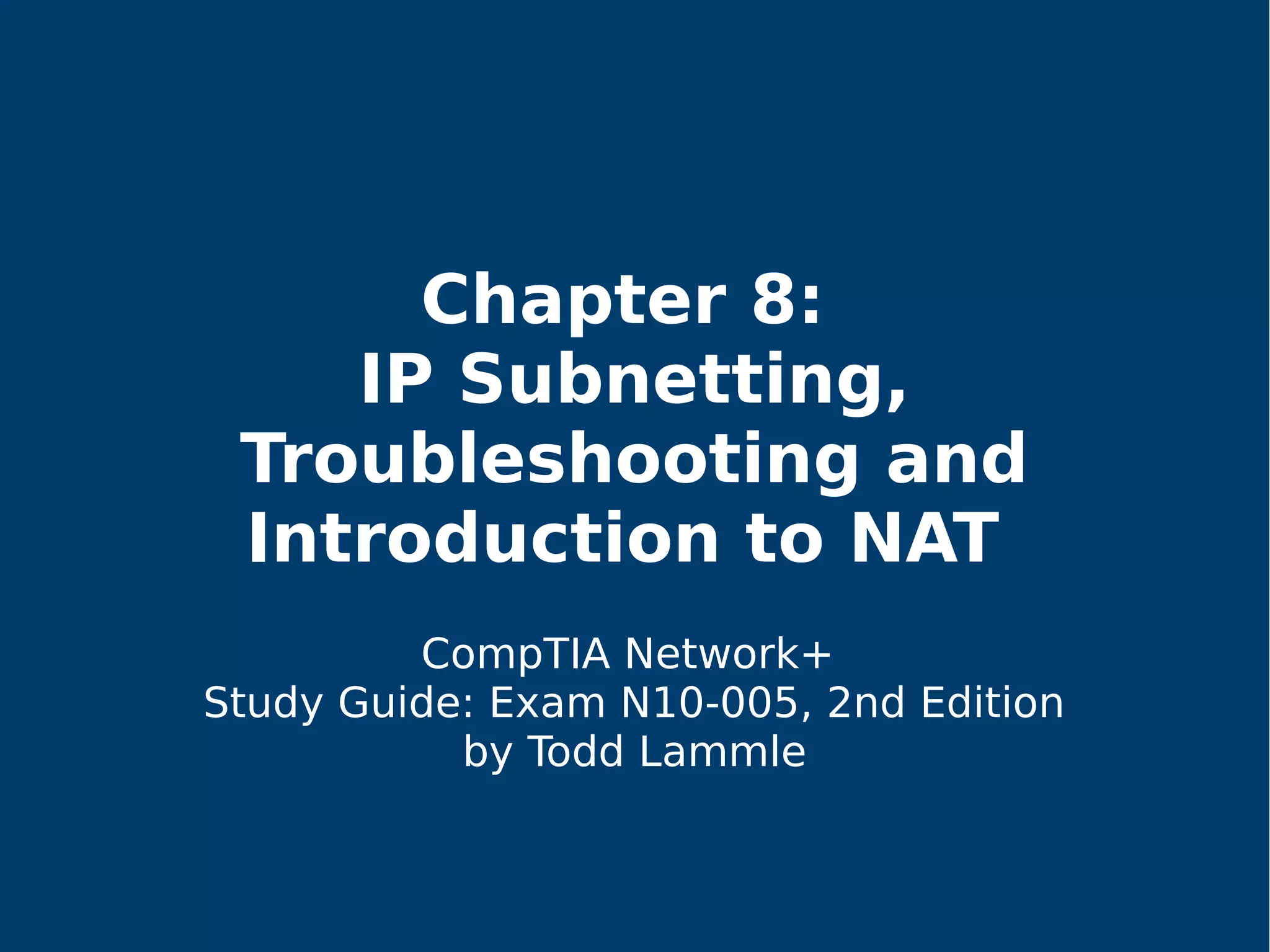 This document provides an overview of IP subnetting, troubleshooting, and network address translation (NAT). It begins by explaining the benefits of subnetting networks, such as reduced traffic and optimized performance. It then discusses how to create subnets by taking bits from the host portion of IP addresses. Several examples are provided of how to subnet Class C networks using different subnet masks. The document also covers troubleshooting IP addressing issues and using command line tools like ping. Finally, it describes network address translation, including different types like static and dynamic NAT, and how NAT works to allow private IP addresses to access the public internet.