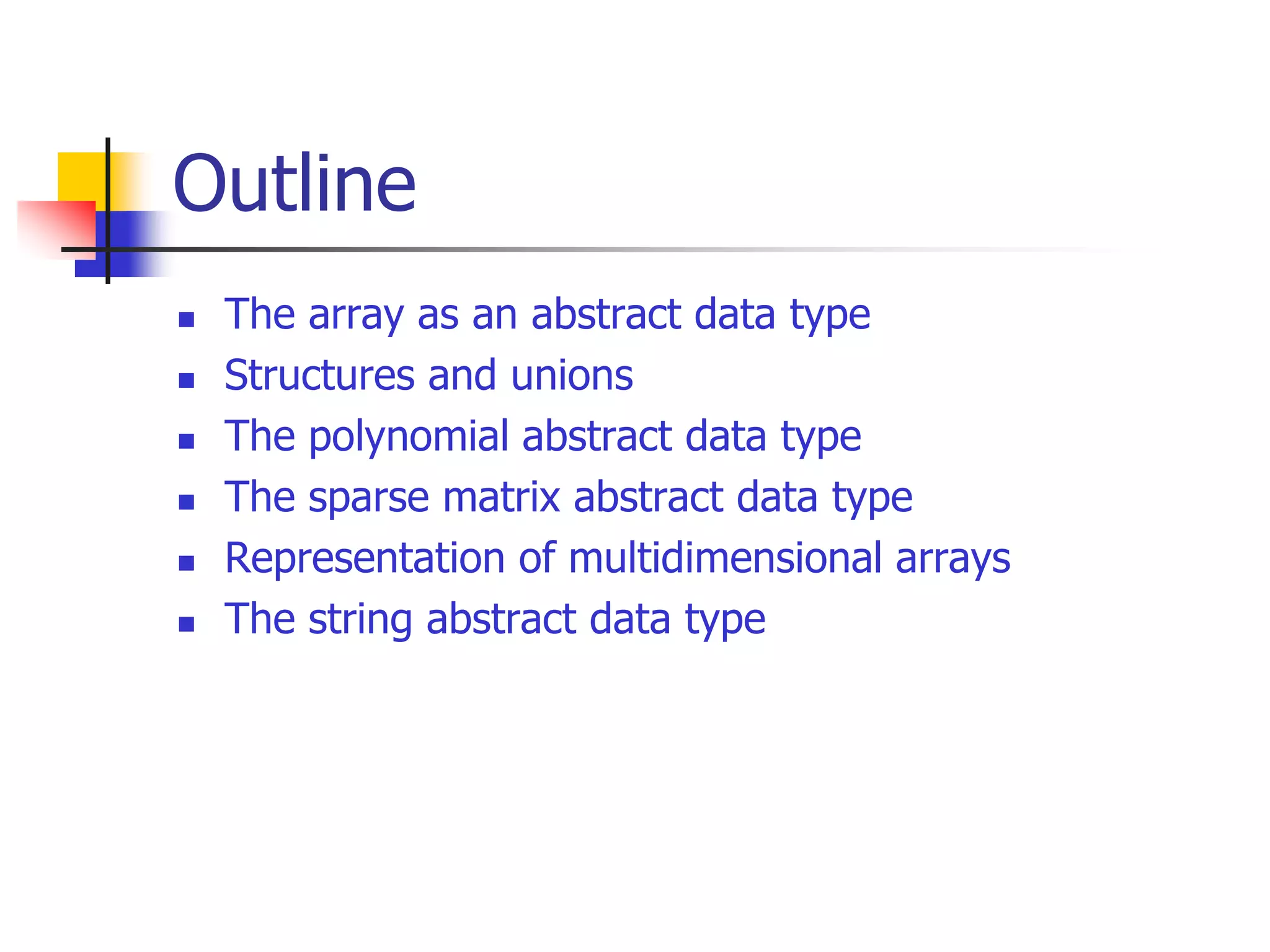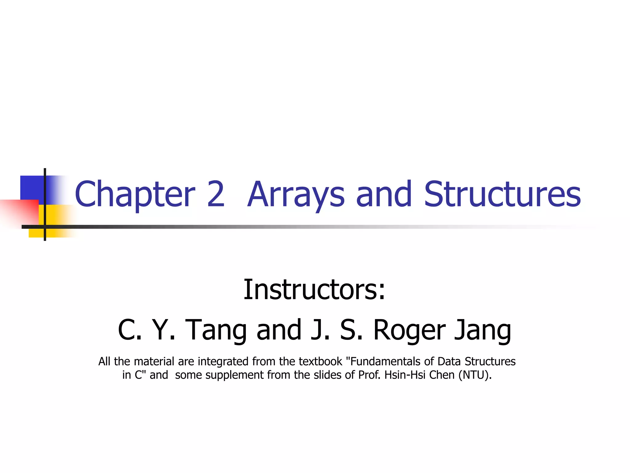 This document summarizes Chapter 2 on arrays and structures from a textbook on data structures in C. It covers various abstract data types including arrays, polynomials, sparse matrices, and strings. It provides examples of implementing one-dimensional and multi-dimensional arrays in C. Structures and unions are described as a way to group heterogeneous data. Self-referential structures and implementation of abstract data types using arrays are also discussed.