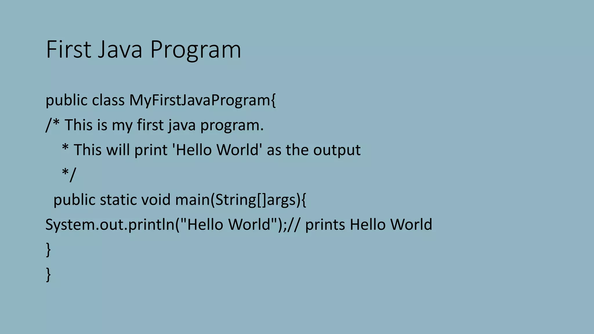 1. The structure of a basic Java program including the class, main method, and print statement.
