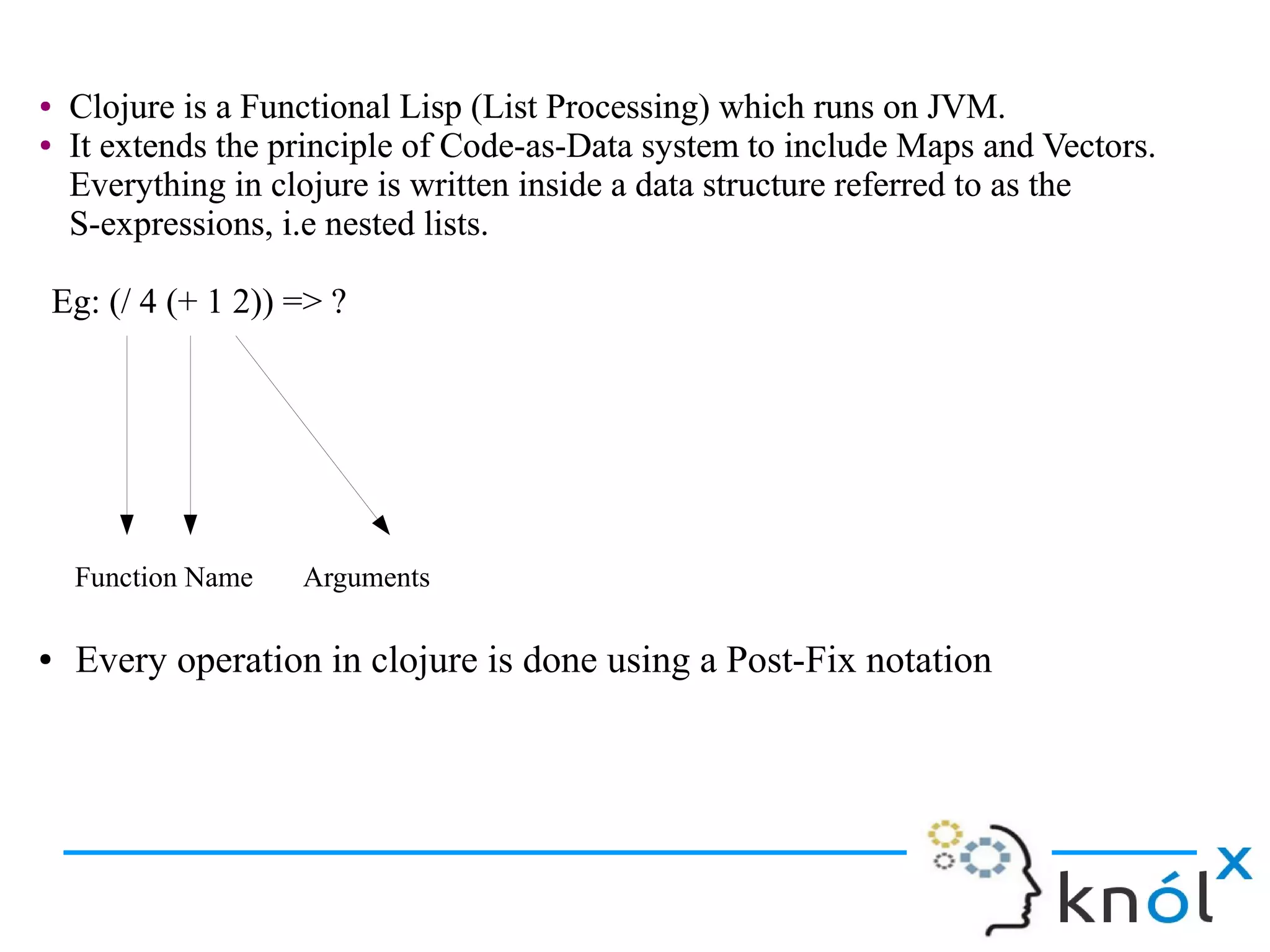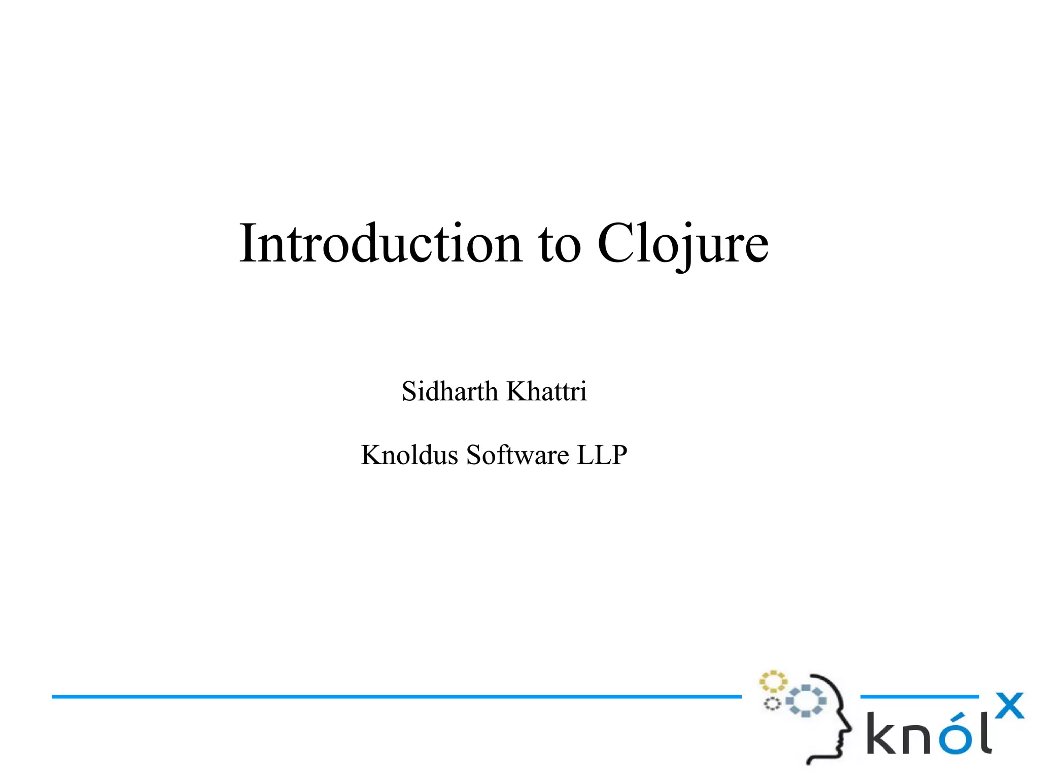 The document provides an introduction to the Clojure programming language. It discusses that Clojure is a functional Lisp dialect that runs on the Java Virtual Machine. It extends the principle of code-as-data to include maps and vectors in addition to lists. The document also provides an overview of Clojure's core data structures, functions, concurrency features like atoms and agents, and how to get started with Clojure.