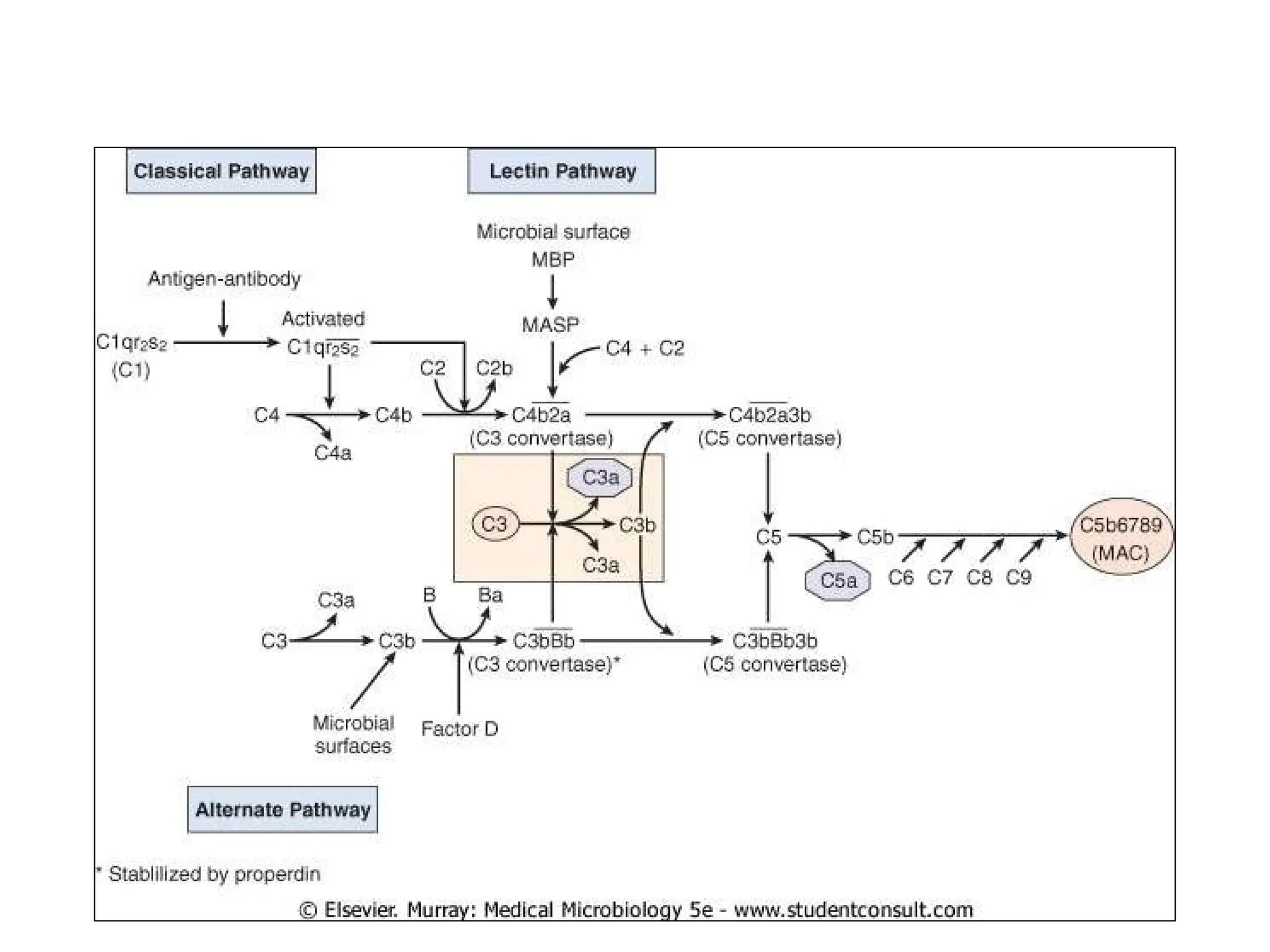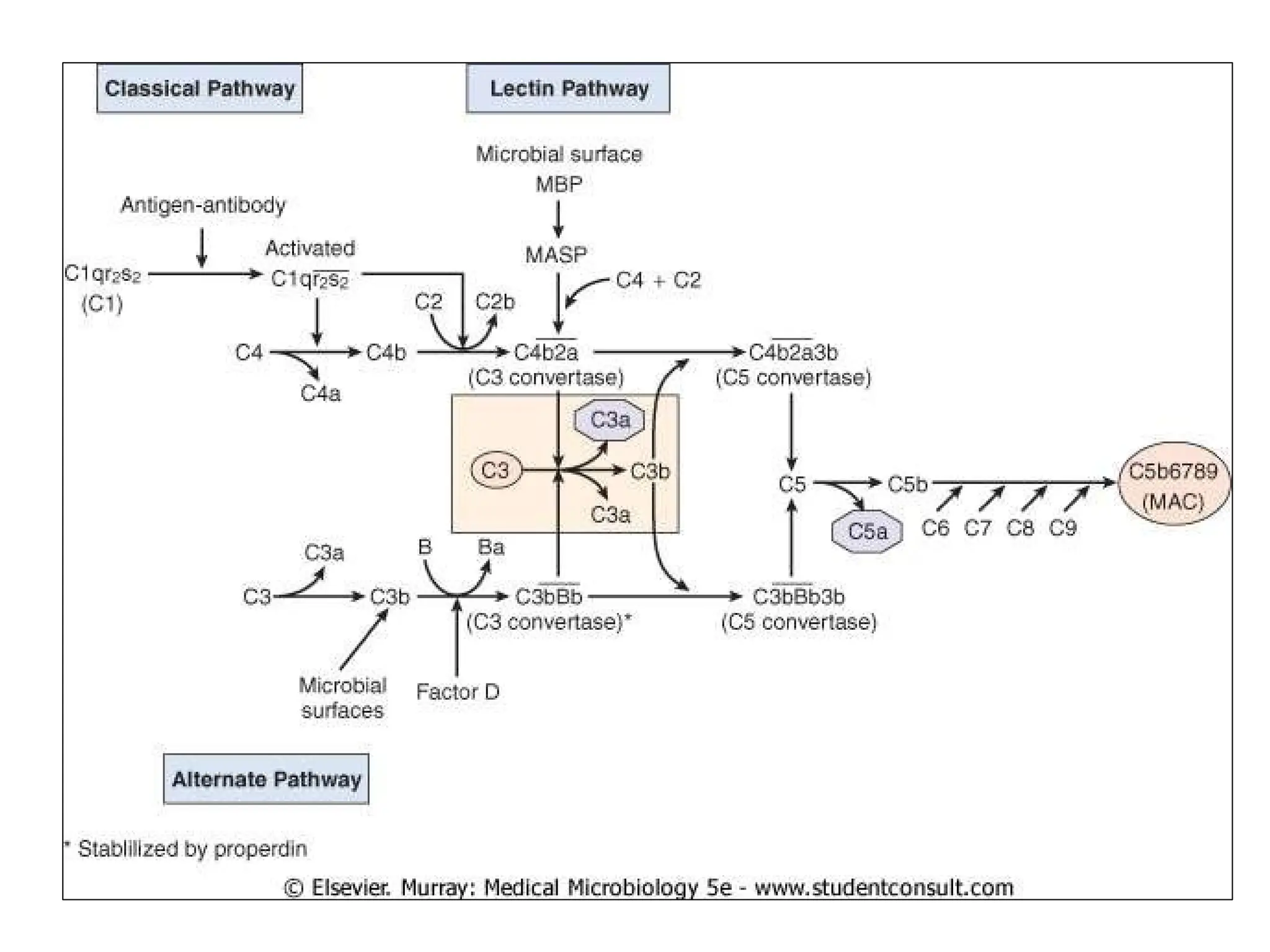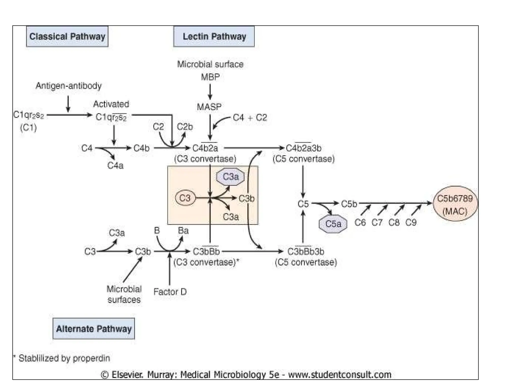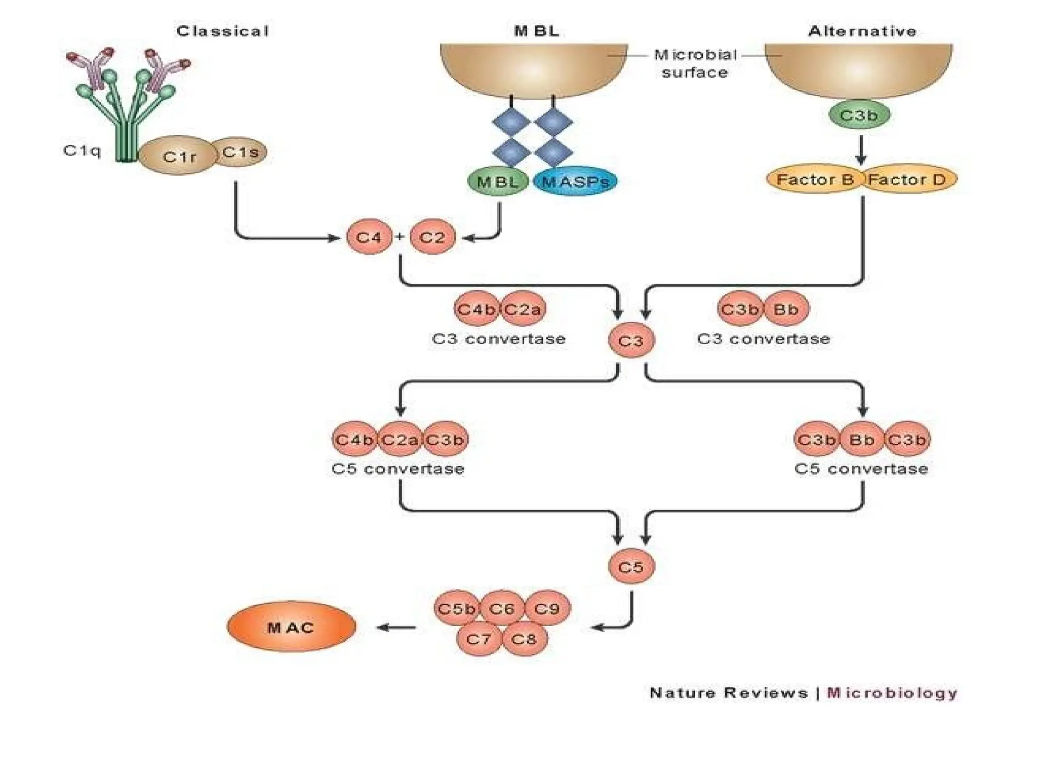 The complement system is a group of approximately 30 proteins that enhance the immune response and play crucial roles in both innate and adaptive immunity, primarily functioning through three activation pathways: classical, alternative, and lectin. Activated via proteolysis, these proteins facilitate the lysis of pathogens, generate inflammation mediators, and promote opsonization. Deficiencies or dysregulation within this system can lead to increased susceptibility to infections and various autoimmune disorders.