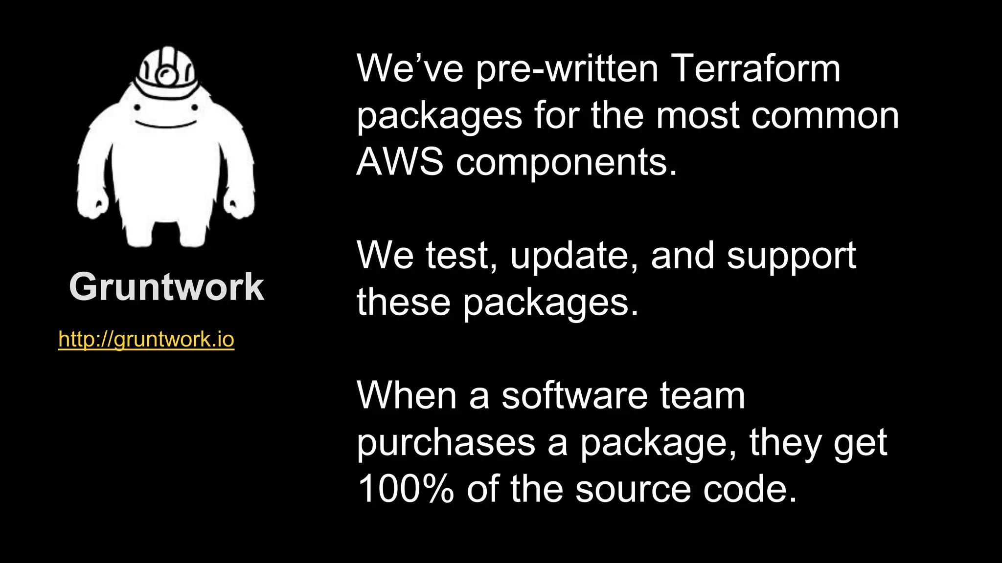 This document provides a comprehensive overview of using Terraform for infrastructure provisioning, detailing its capabilities, including state management, module reusability, and best practices for deploying resources on AWS. It also introduces the Terragrunt tool for enhanced Terraform management, focusing on features like remote state storage, locking, and structured project organization across different environments. The document further explains how to parameterize templates and use loops and conditional statements to manage resources effectively.