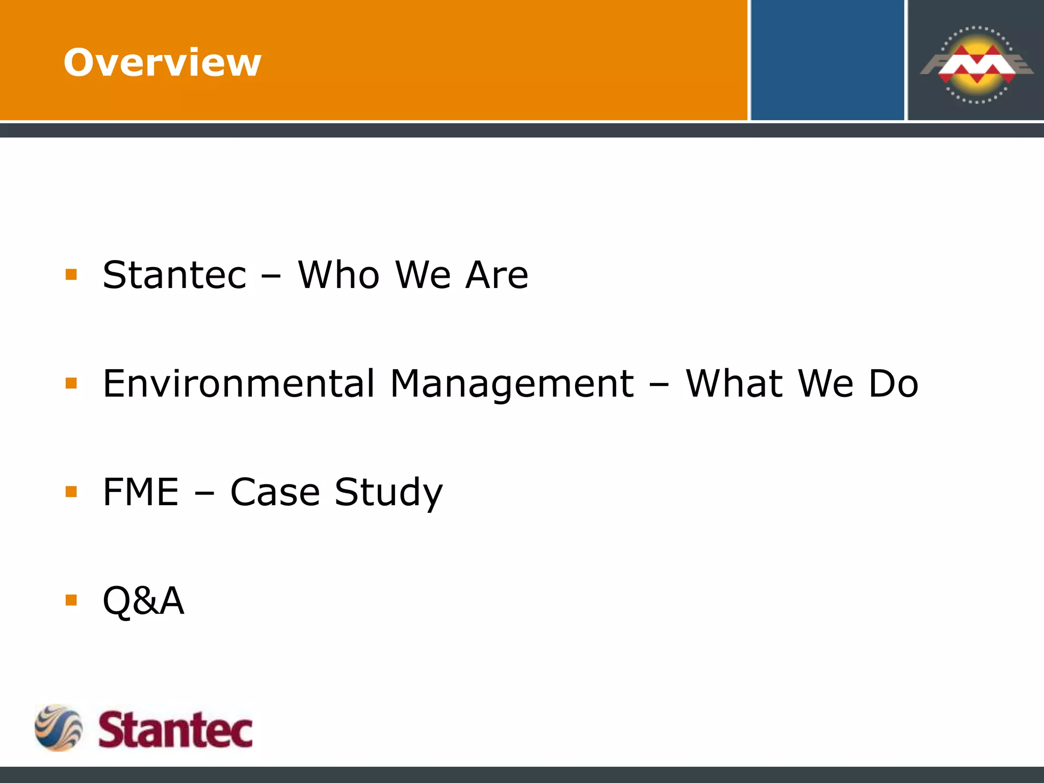 The document discusses Stantec's capabilities in environmental management and GIS services, highlighting their extensive staff and operational history. It outlines a case study involving constraint mapping for linear projects and various environmental factors. A brief overview of their workbench tools and an invitation for questions conclude the presentation.