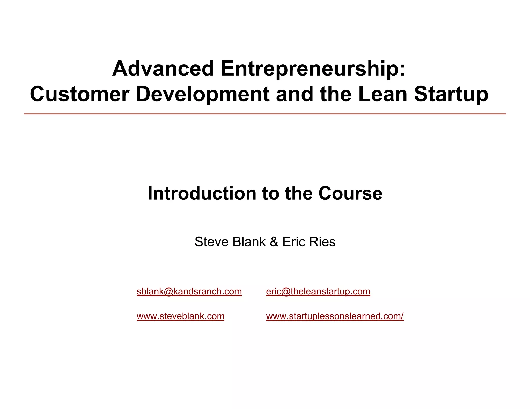 This document provides an introduction to an advanced entrepreneurship course on customer development and the lean startup methodology. It outlines the course objectives, prerequisites, structure, and key concepts that will be covered, including reducing product/market risk, customer development process of discovery, validation, and creation, and building companies with low costs by designing for learning rather than traditional product development processes. The instructors are introduced as Steve Blank and Eric Ries, pioneers of the lean startup approach.