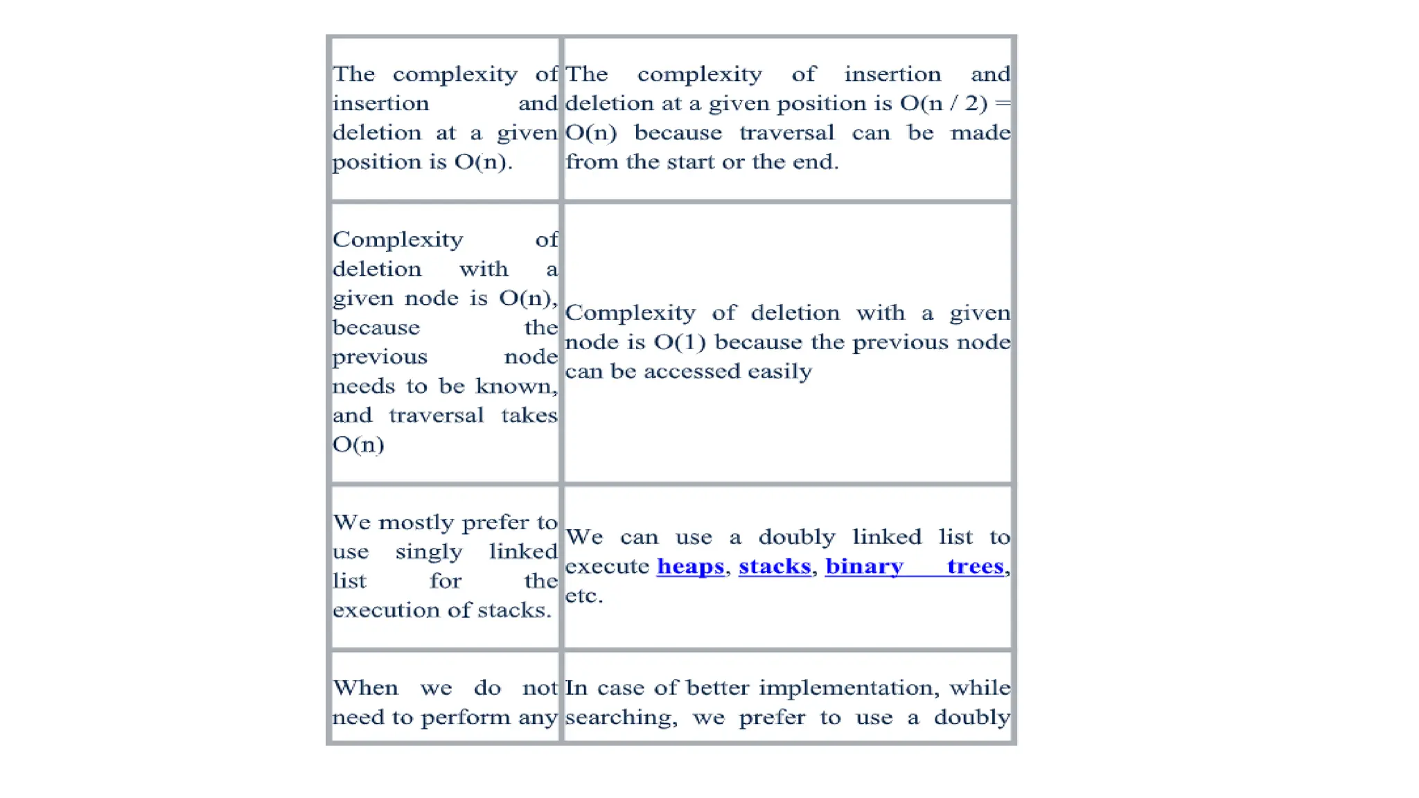 • Insertion and deletion at any point in a linked list take O(1) time.