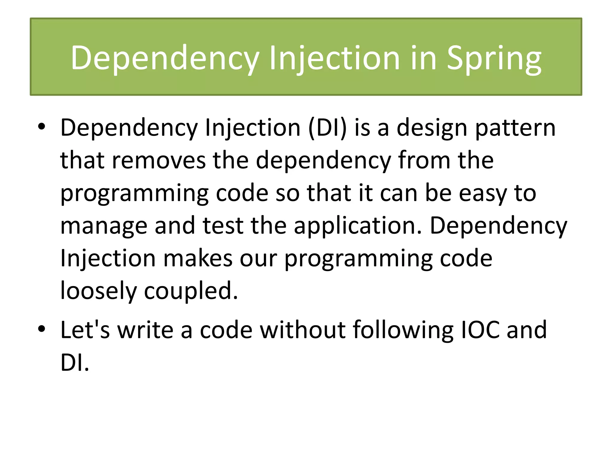The document discusses dependency injection (DI) in the Spring framework, explaining how it allows for loosely coupled code through constructor and setter methods. It includes examples of injecting primitive values, dependent objects, and collections into beans via XML configuration. The document also touches on bean inheritance and provides code snippets demonstrating various DI techniques.