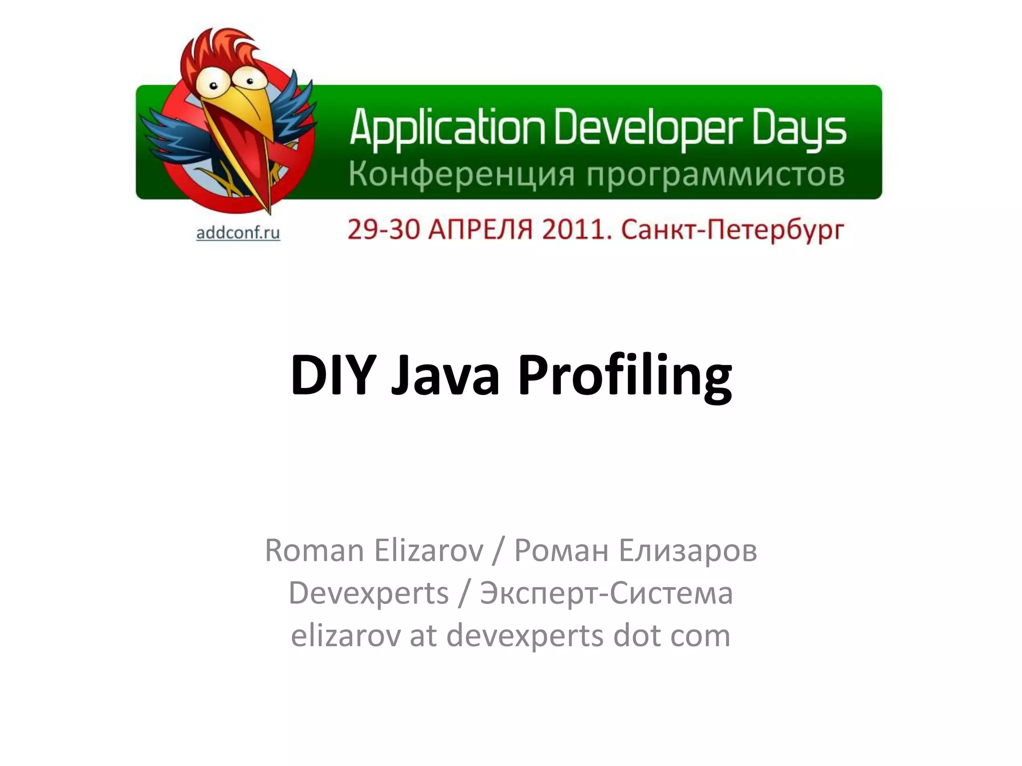This document discusses different approaches for profiling Java applications without using third-party tools. It begins by explaining the benefits of a do-it-yourself approach such as avoiding reliability and compliance concerns with tools. Various profiling types are then covered, including CPU profiling using wall clock time and calls, sampling, and memory profiling using JVM options. Bytecode manipulation is also presented as a method using ASM to add profiling code without changing sources. The document emphasizes learning the Java Virtual Machine and using its built-in capabilities for profiling purposes.