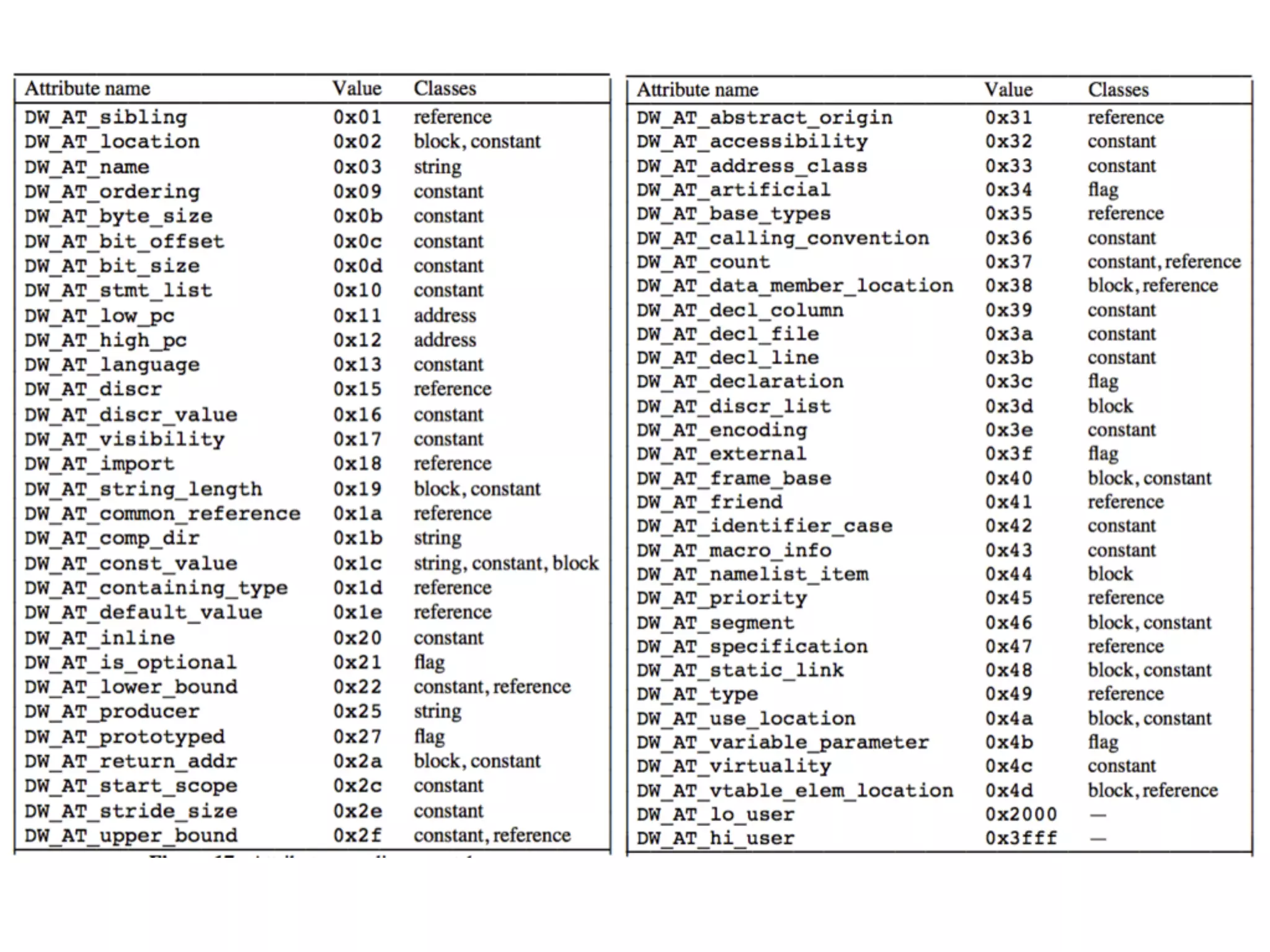 The document describes the DWARF debugging format specification. It includes sections for debug_info, debug_abbrev, debug_line, debug_frame, and debug_aranges. The debug_info section contains compilation unit headers and debugging information entries. The debug_abbrev section contains abbreviation declarations that specify tags and attributes for debugging information entries. The debug_frame section contains Call Frame Information including CIE and FDE entries that describe how registers are saved and restored by procedures.