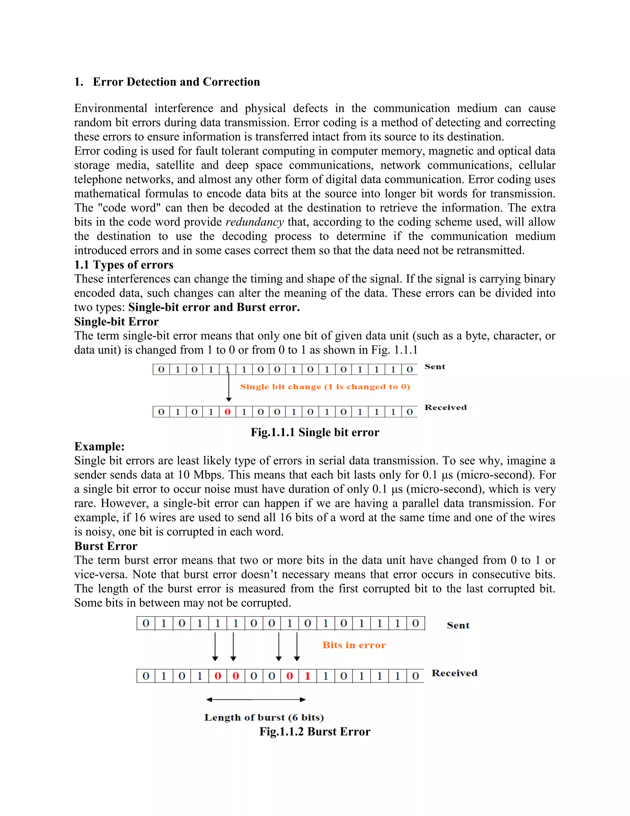 Error coding uses mathematical formulas to encode data bits into longer code words for transmission. This allows errors caused by environmental interference to be detected and sometimes corrected at the destination. There are two main types of error coding: error-detecting codes and error-correcting codes. Error-detecting codes add enough redundancy to allow errors to be detected but not corrected, while error-correcting codes add more redundancy to allow errors to be corrected. Common error-detecting coding techniques include parity checks, checksums, and cyclic redundancy checks (CRCs). These techniques use additional redundant bits appended to the data to facilitate error detection. CRC is particularly powerful as it can detect all single-bit errors and many burst errors.