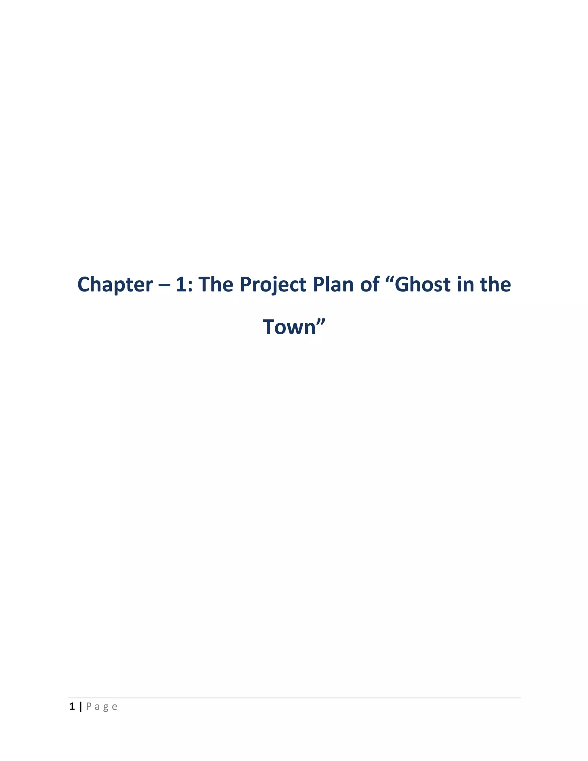 The document provides details of the project plan for the game "Ghost in the Town". It discusses the background and scope of the project, which involves creating a single-player strategy game for Android devices. It outlines the project schedule, with stages including planning, design and implementation, testing, and submission. It aims to provide both structured and unstructured information about the virtual world and story of the game.