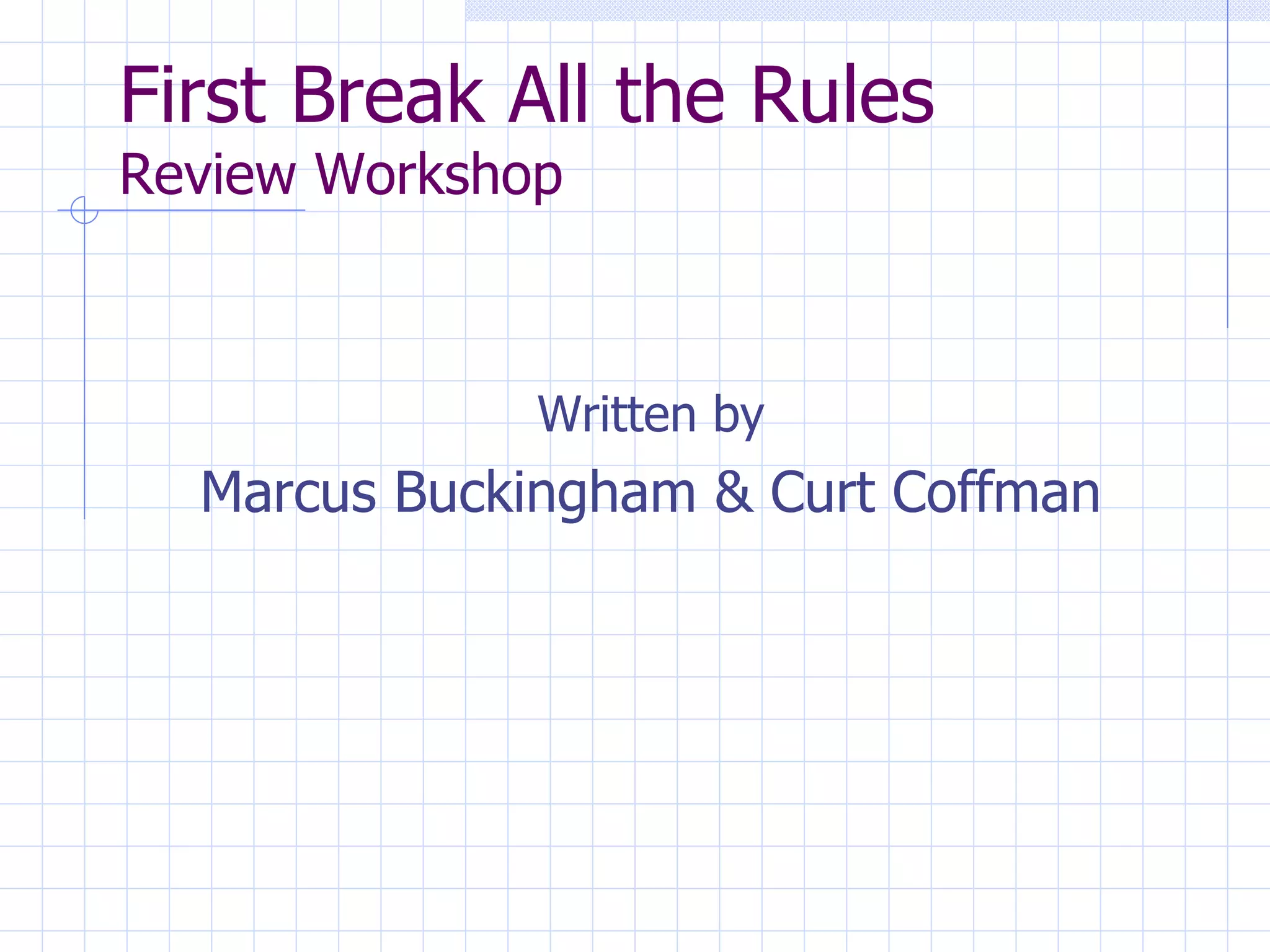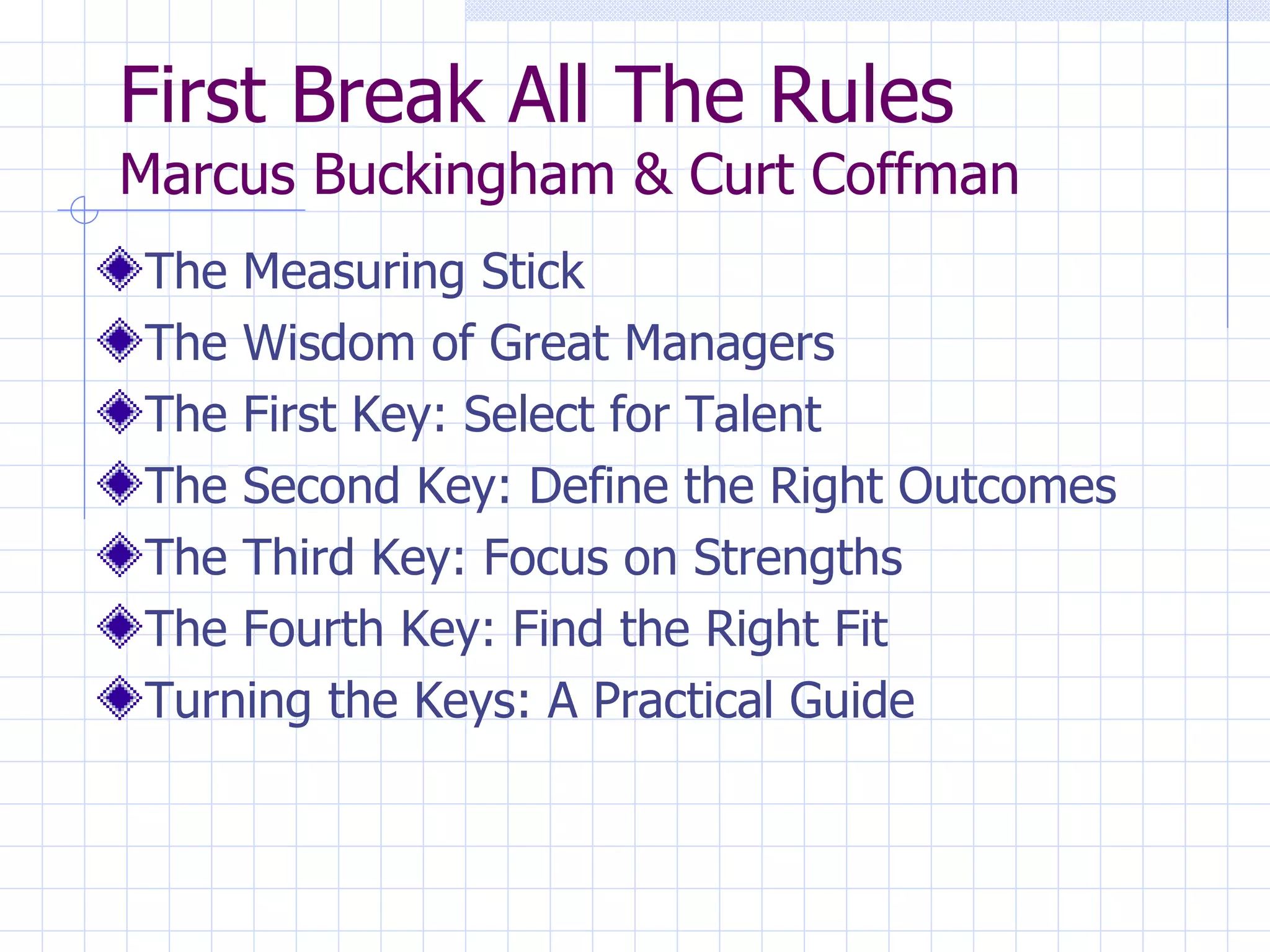 This document summarizes key points from the book "First Break All the Rules" by Marcus Buckingham and Curt Coffman. It discusses the book's four main concepts for managing talent: selecting for talent over experience; defining the right outcomes rather than steps; focusing on strengths rather than weaknesses; and finding the right fit rather than the next rung. It provides examples of how to implement each concept through interviewing, performance reviews, and career development conversations.