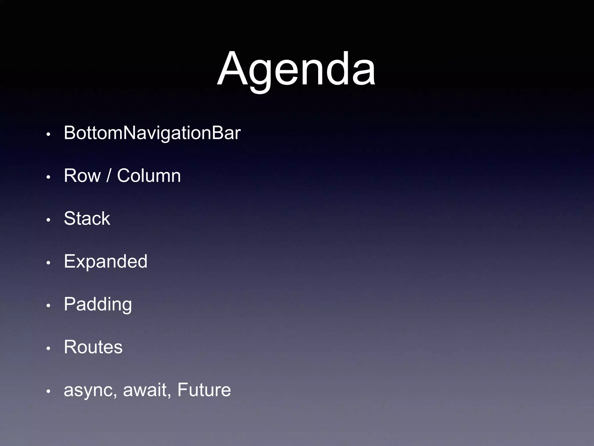 The document discusses various Flutter widgets including BottomNavigationBar, Row, Column, Stack, Expanded, and Padding. It explains how to use these widgets to layout apps and position elements. It also covers asynchronous programming concepts like async/await and Futures and how they are used to handle asynchronous code in Dart. Key topics are future chaining with then/catch, async functions, and awaiting Futures. The document ends with questions about Futures and print order.