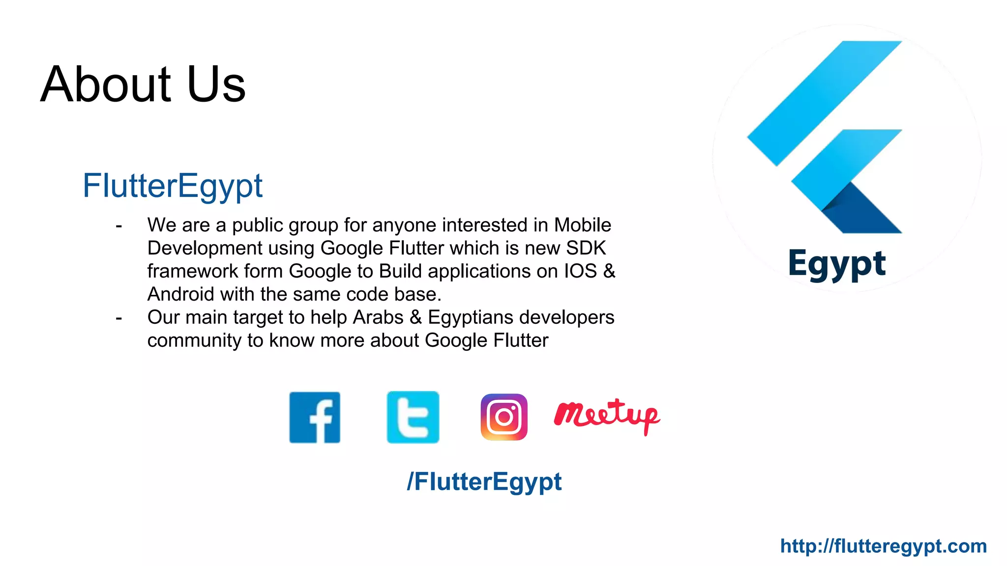 FlutterEgypt is a community group focused on helping Arab and Egyptian developers learn about Google Flutter, a framework for building mobile apps using a single codebase for both Android and iOS. The group holds meetups and collaborates with Google Developers to teach about Flutter. The founder, Ahmed Abu Eldahab, is a mobile developer with over 15 years of experience who started the group to promote Flutter in the region.