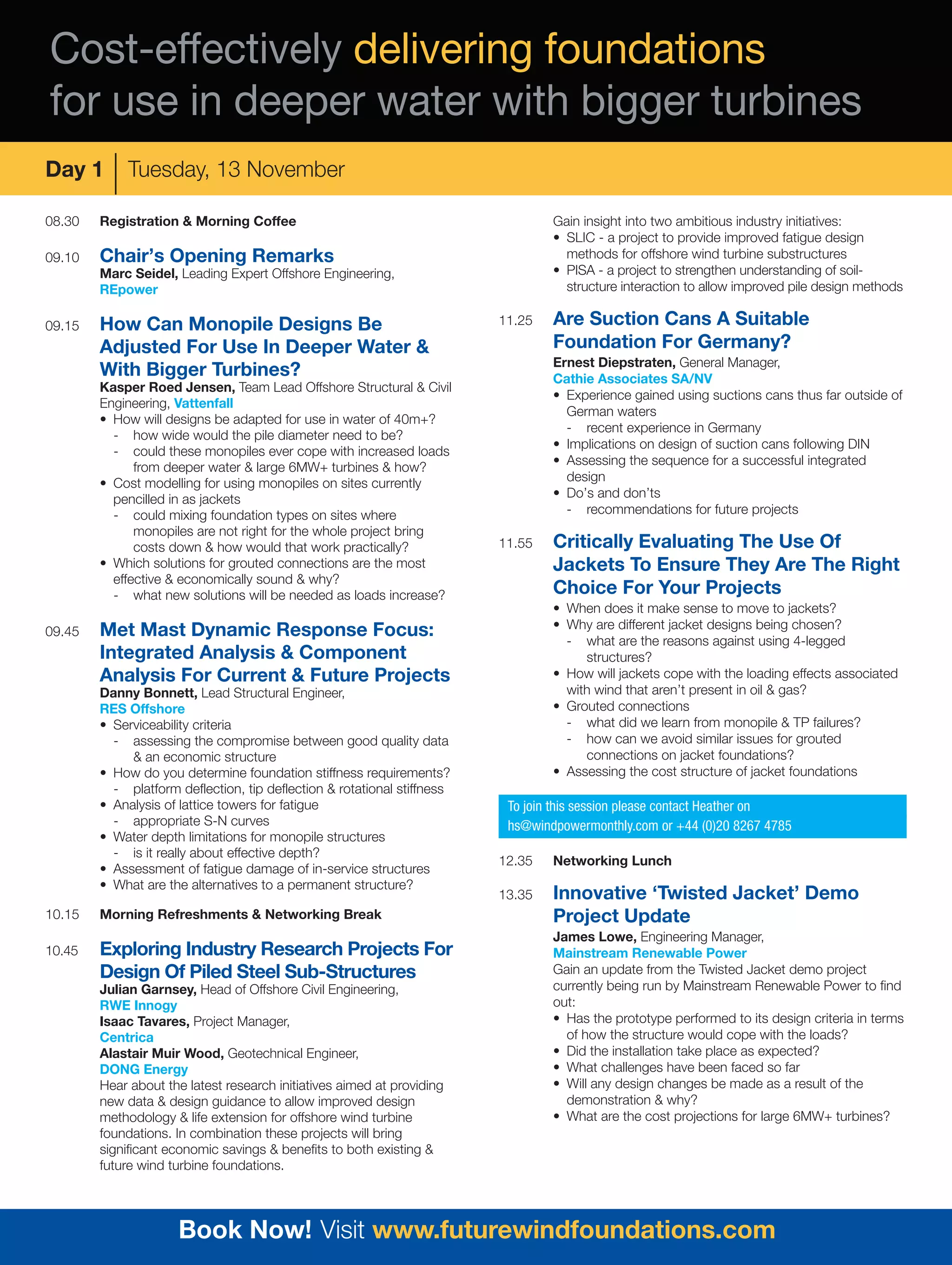 The document discusses a future offshore foundations conference focused on cost-effectively delivering foundations for deeper waters and larger turbines. The two-day conference will provide insights into adapting monopile and jacket designs for new projects, innovative demo projects, installing and maintaining different foundation types, and strategies for reducing costs through industrialized manufacturing and logistics. Speakers will address topics like adjusting monopile and jacket designs, innovative demo projects like Windfloat and Twisted Jackets, optimizing foundation choice for projects, fabricating foundations at large scales, and developing robust logistics plans.