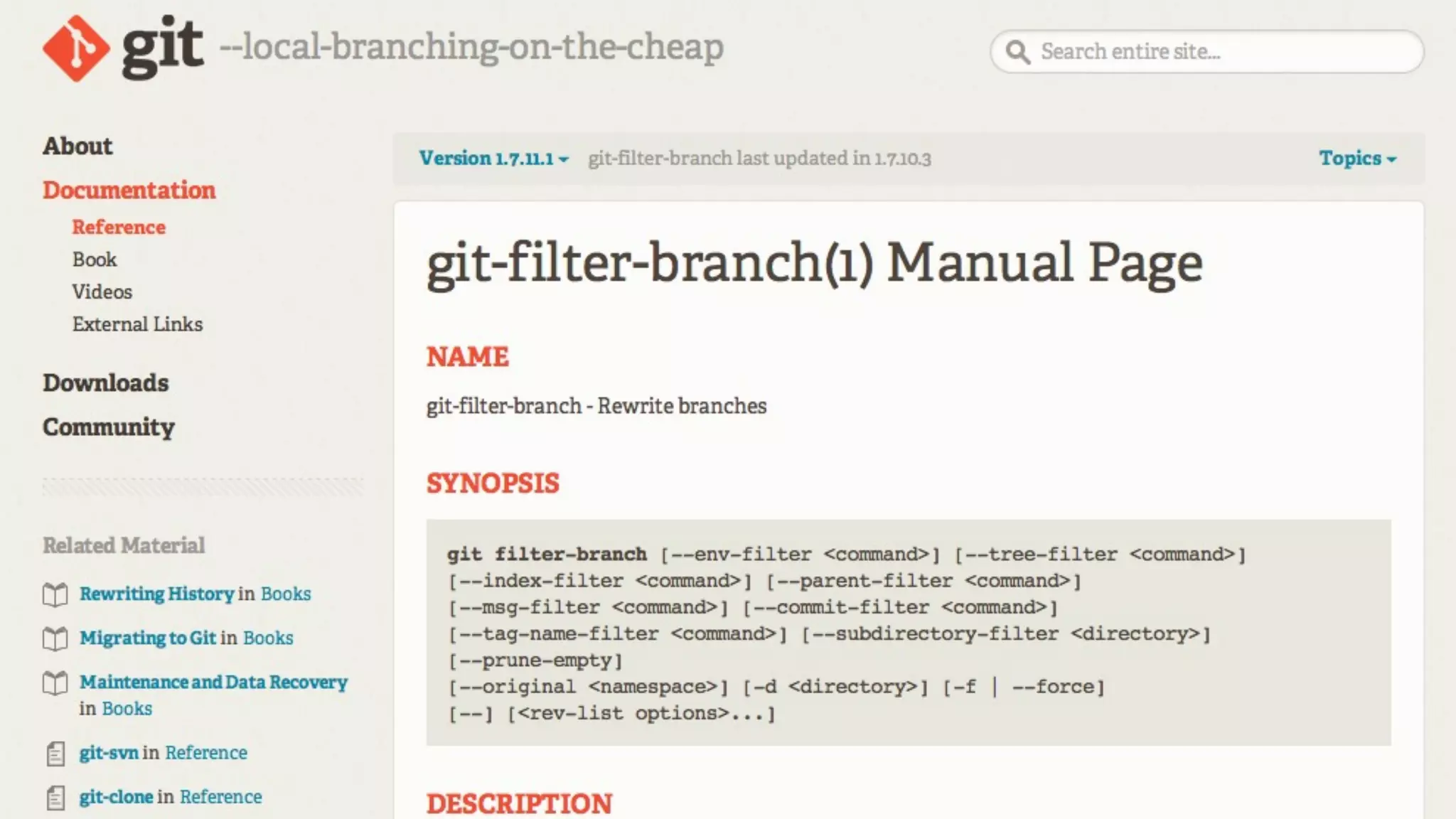 The document discusses the Git command 'filter-branch,' which allows users to rewrite Git revision history by applying various custom filters to branches. It highlights different modes of operation such as --env-filter, --tree-filter, and more, each allowing specific modifications to commits and their associated data. Additionally, users are cautioned that using this command creates a new repository with different hashes for modified commits.