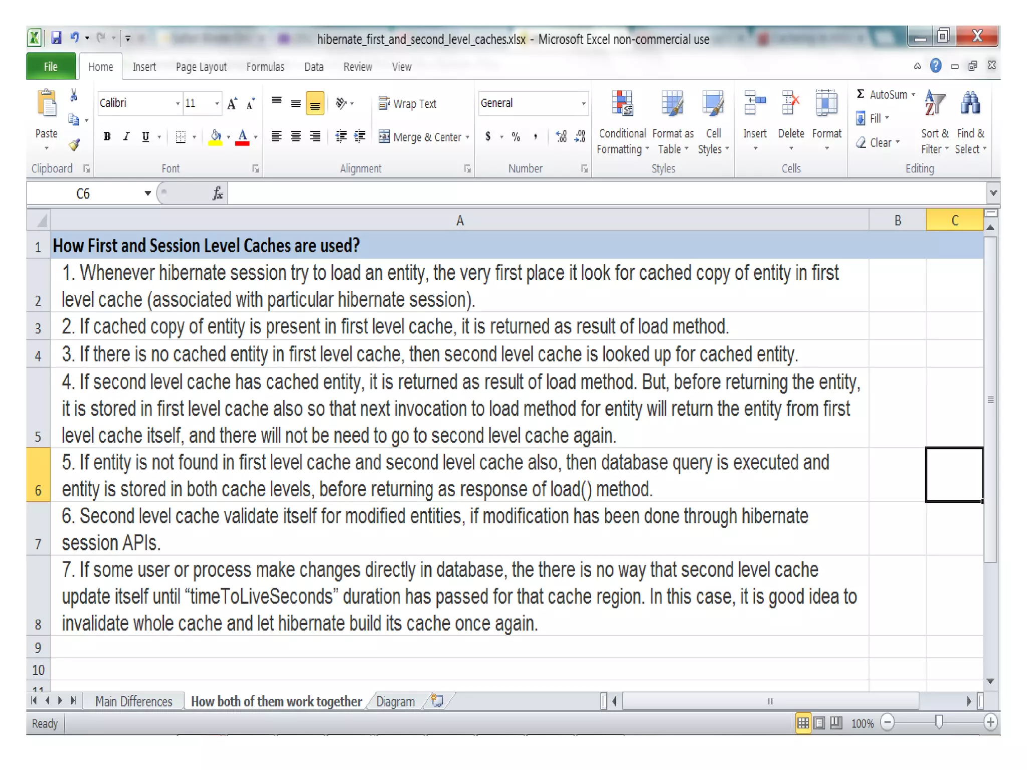 Hibernate provides two levels of caching for entities - a first level cache and a second level cache. The first level cache is active by default and caches entities within a session. The second level cache requires additional configuration and caches entities across sessions but within a single application. The document includes an example program demonstrating usage of Hibernate's second level cache.