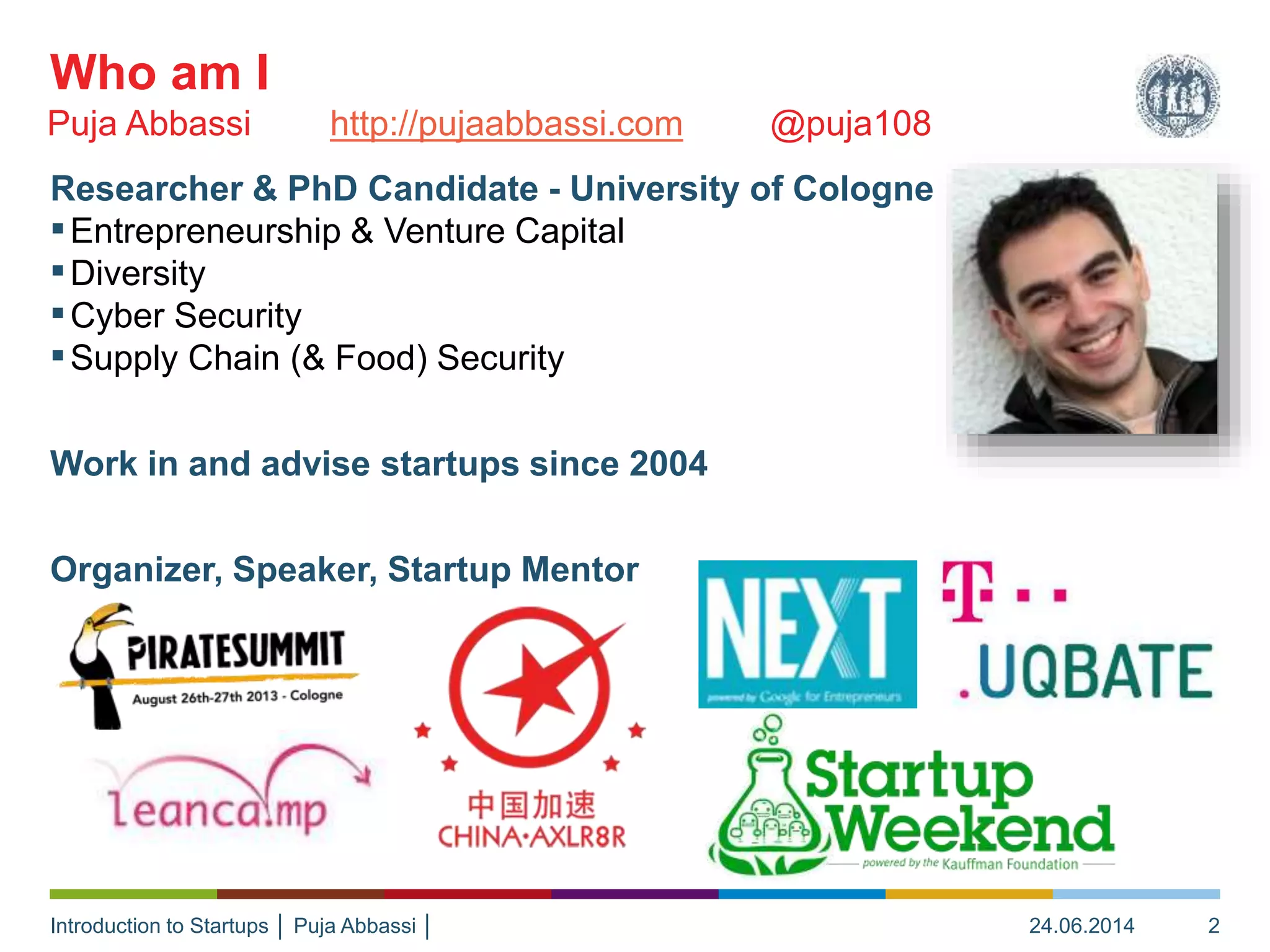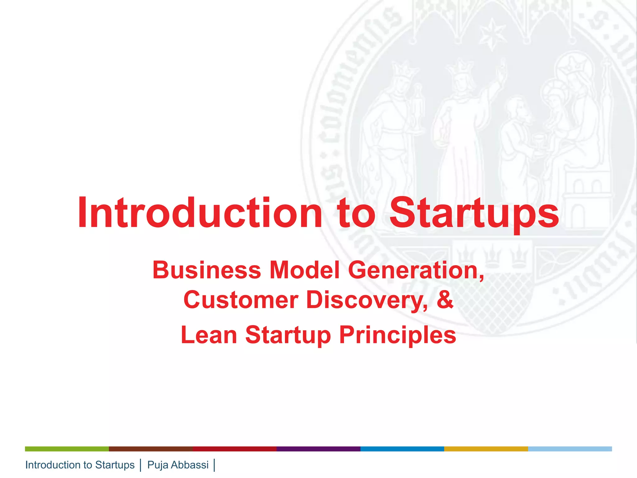 The document introduces startups and differentiates them from traditional companies, highlighting that startups are temporary organizations focused on developing a repeatable and scalable business model. It discusses the importance of customer development, product/market fit, and the iterative processes of building and validating business models through frameworks such as the Business Model Canvas. Key concepts include understanding competition, customer relationships, and the significance of addressing customer needs to succeed in the startup ecosystem.