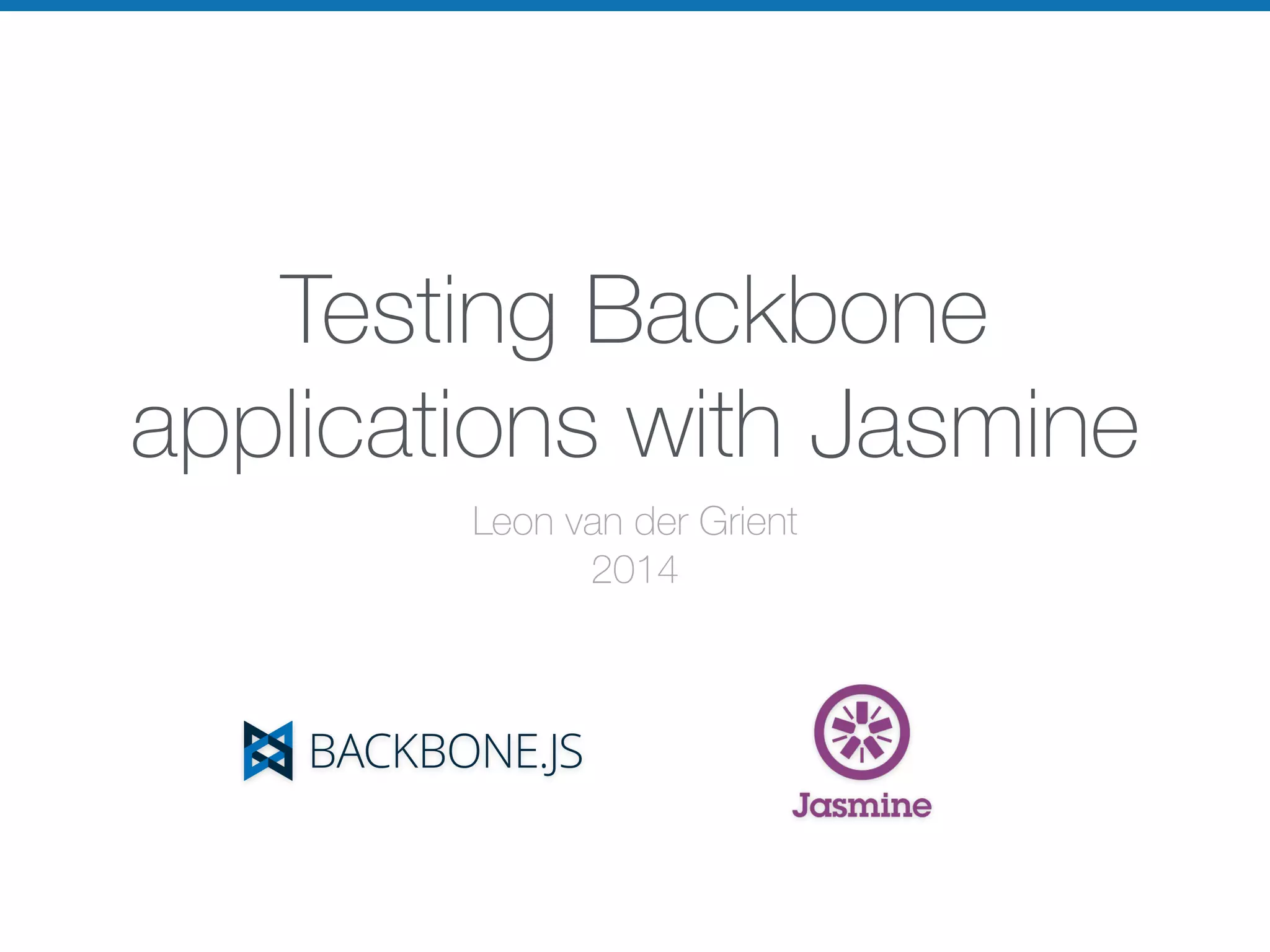 This document discusses testing Backbone applications with Jasmine. It provides examples of how to test models, views, user interactions, and more. Key points covered include: