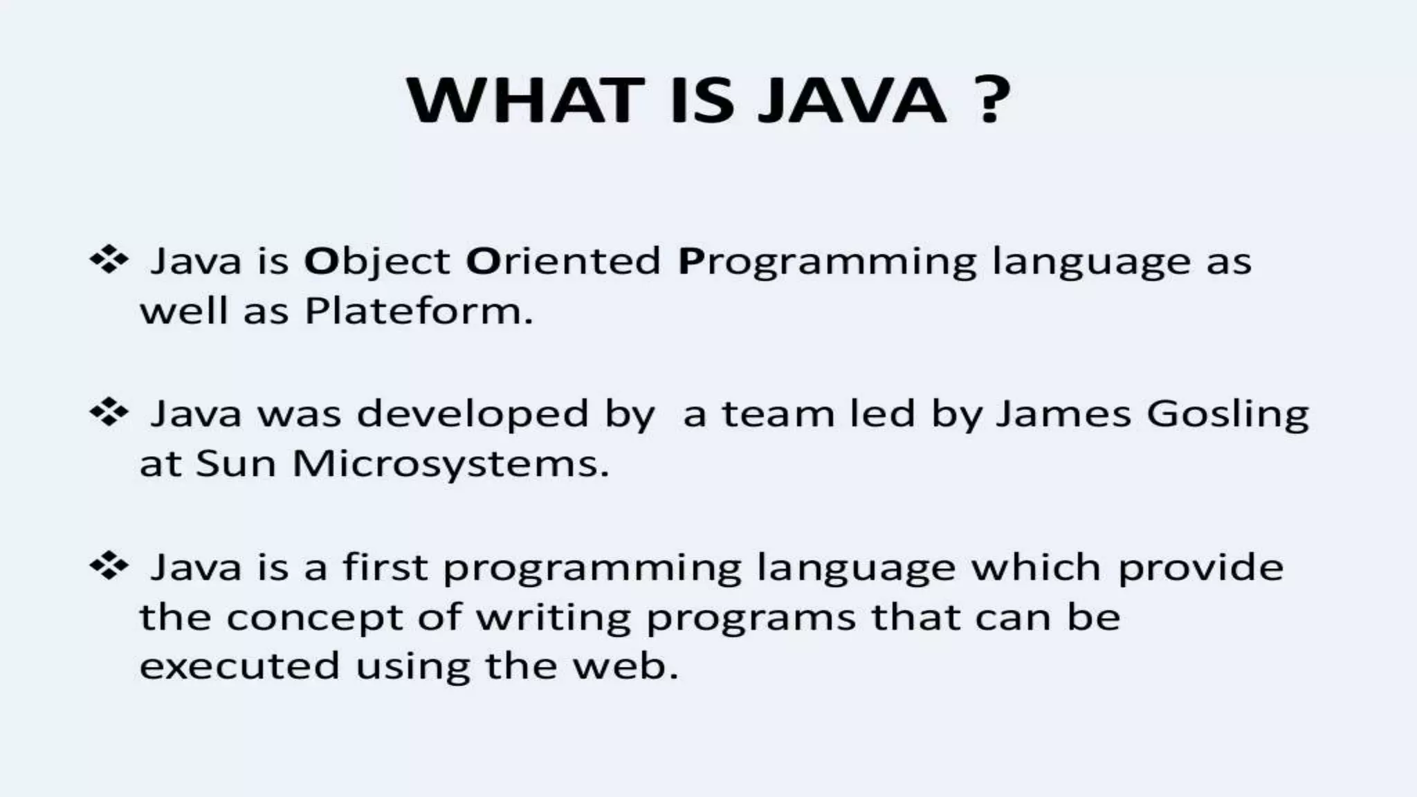 Java is an object-oriented programming language that can create applications that run on multiple platforms. When a Java program is compiled, it produces bytecode that can run on any system with a Java Virtual Machine. The file must contain a public class that matches the file name and can include import statements for external libraries.