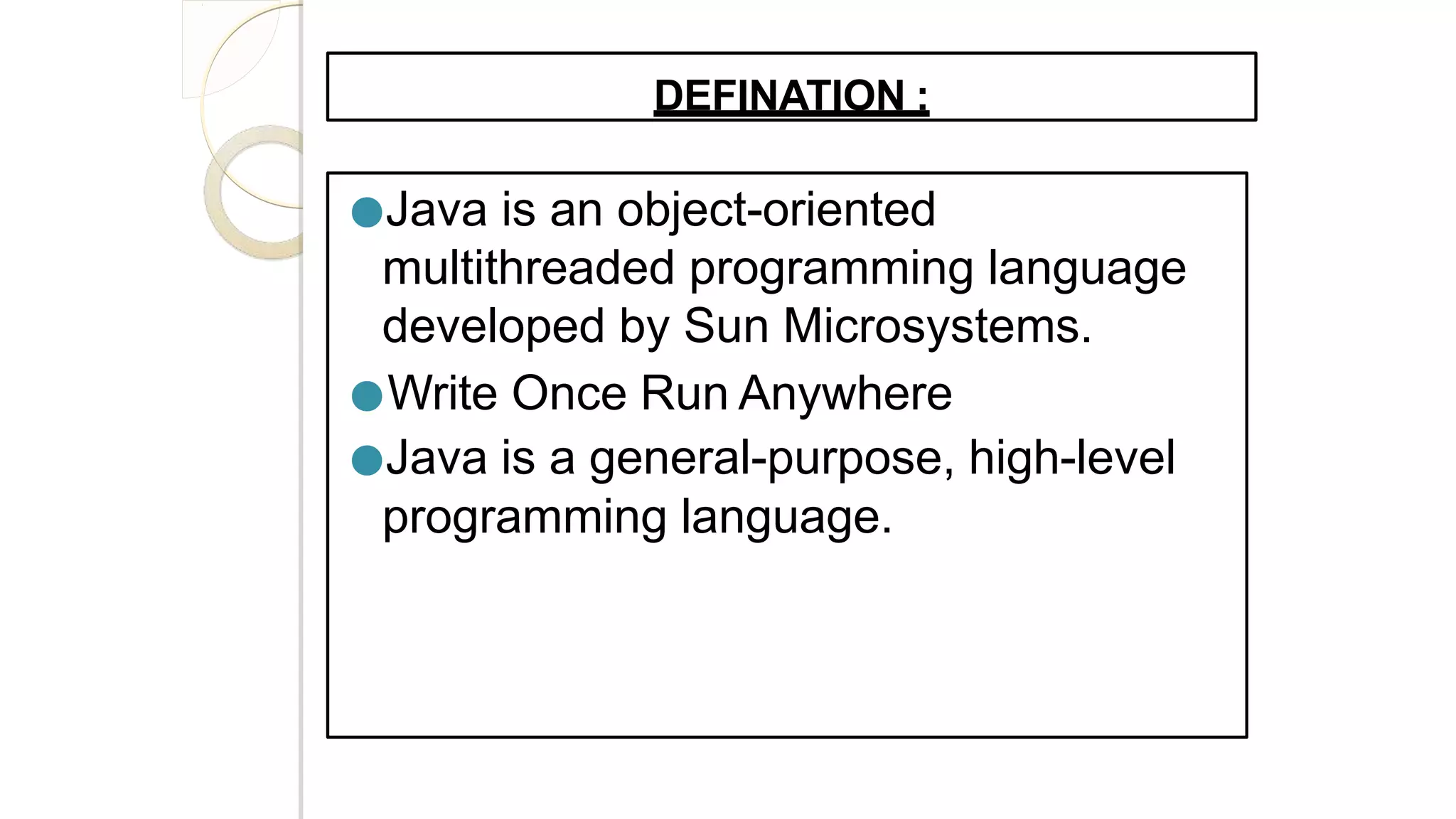 Java is a general-purpose, class-based, object-oriented programming language that is designed to be portable and deliver high performance. It achieves portability by compiling Java code to bytecode that runs on the Java Virtual Machine (JVM) which is available for many hardware and software platforms. Key features of Java include being write once, run anywhere, object-oriented, platform independent, simple, secure, robust, multithreaded, and dynamic. Java applications can run on desktops, servers, mobile devices, and other platforms.