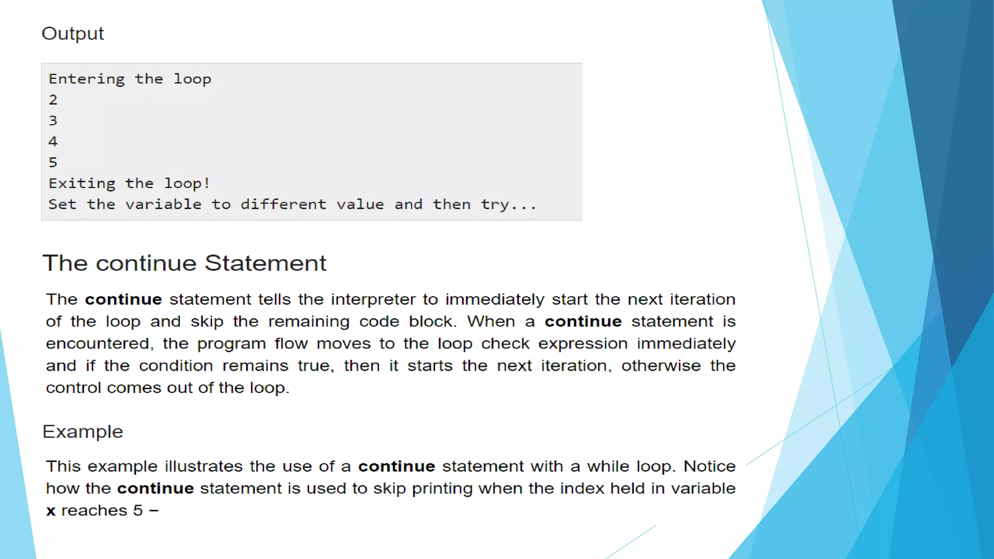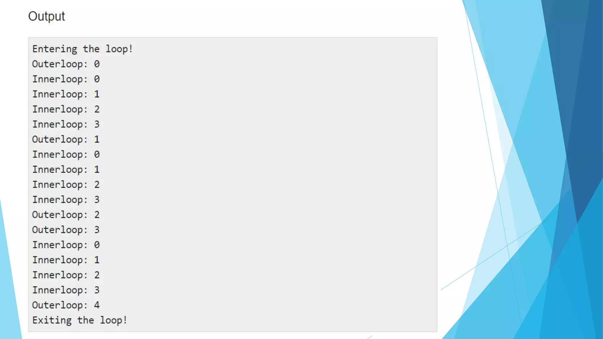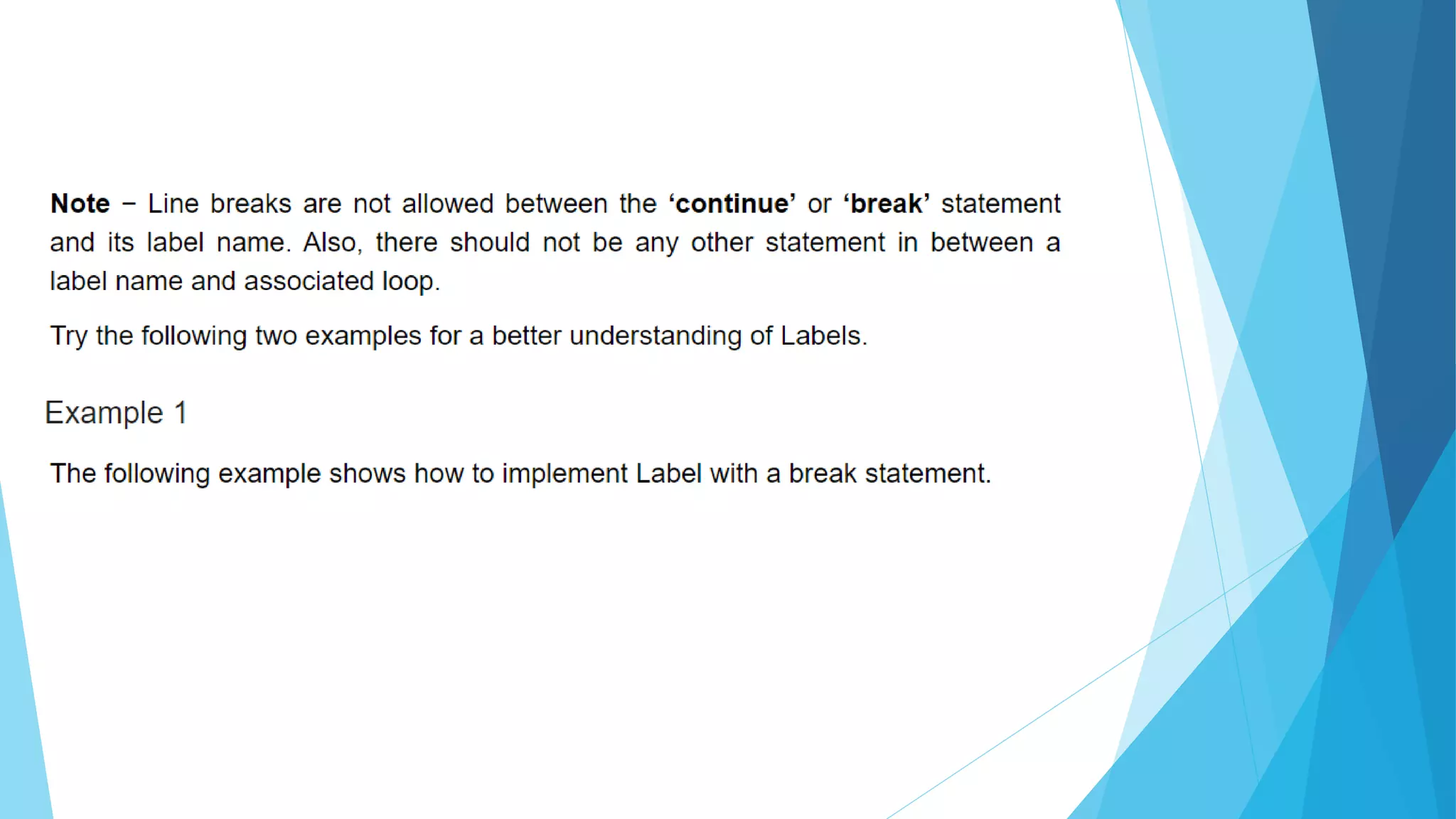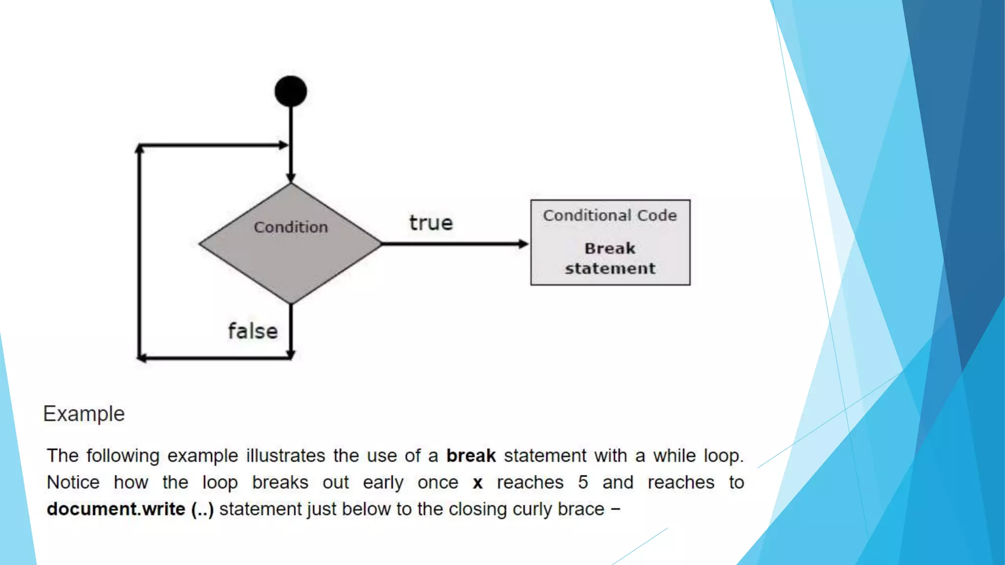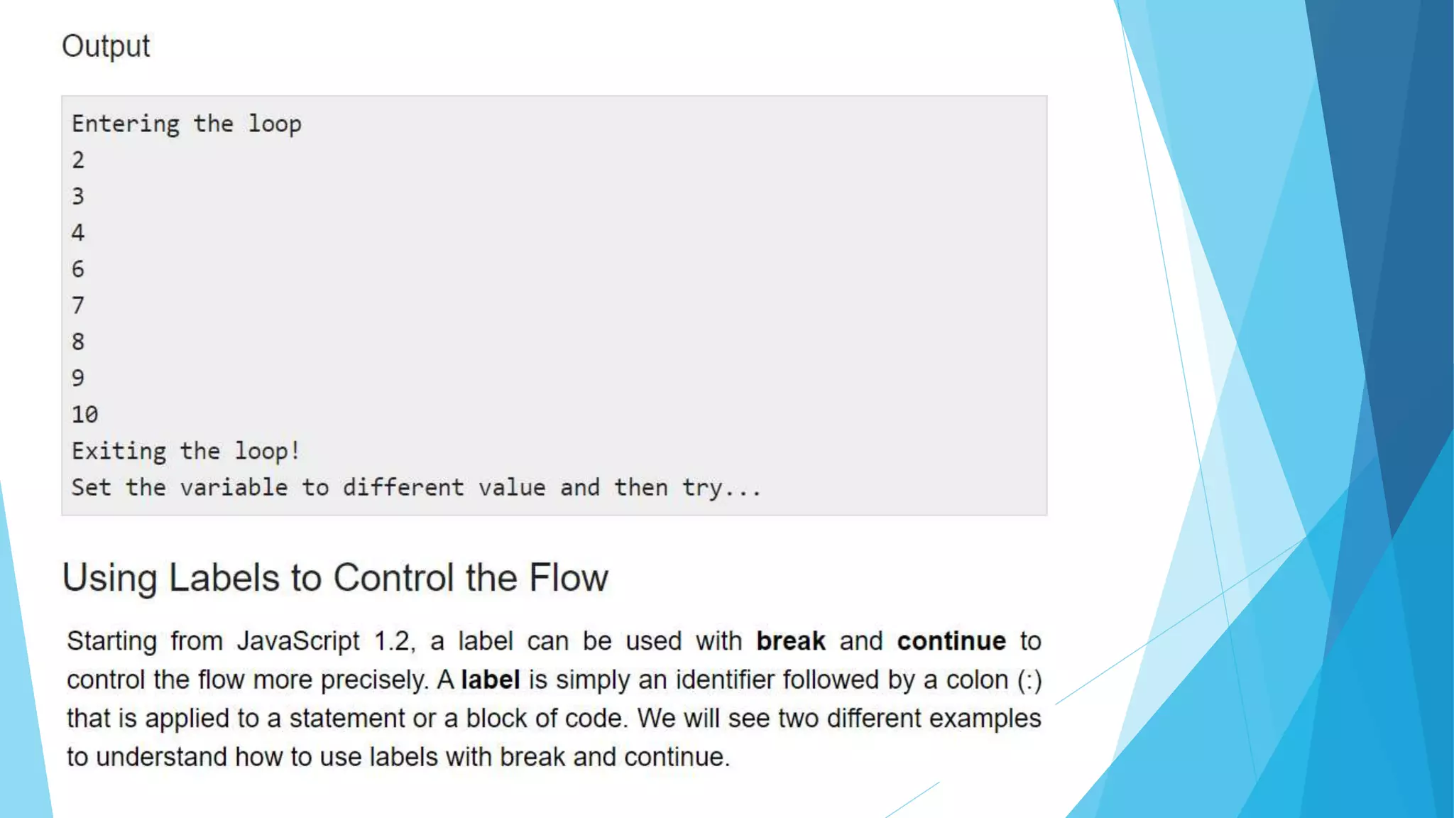 The document contains 4 examples of JavaScript loop control structures: 1) A while loop that breaks out of the loop when the variable x equals 5, otherwise incrementing x. 2) A while loop using continue to skip printing when x equals 5, otherwise incrementing x. 3) Nested for loops using break to exit inner and outer loops at different conditions, and continue to skip to next inner iteration. 4) Nested for loops using continue to skip to next outer iteration when the inner loop variable j equals 3.