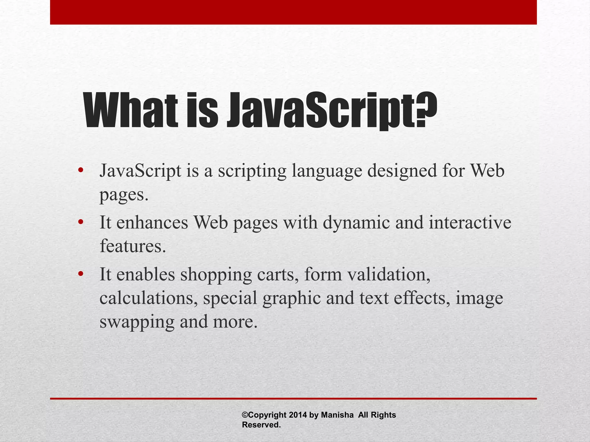 The document provides an introduction to JavaScript as a scripting language for web pages, detailing its capabilities for creating dynamic and interactive features. It covers different methods of implementing JavaScript, important terminology, event handlers, and options for form validation. Additionally, it explains how to access HTML elements and CSS properties using JavaScript to enhance user interactions.